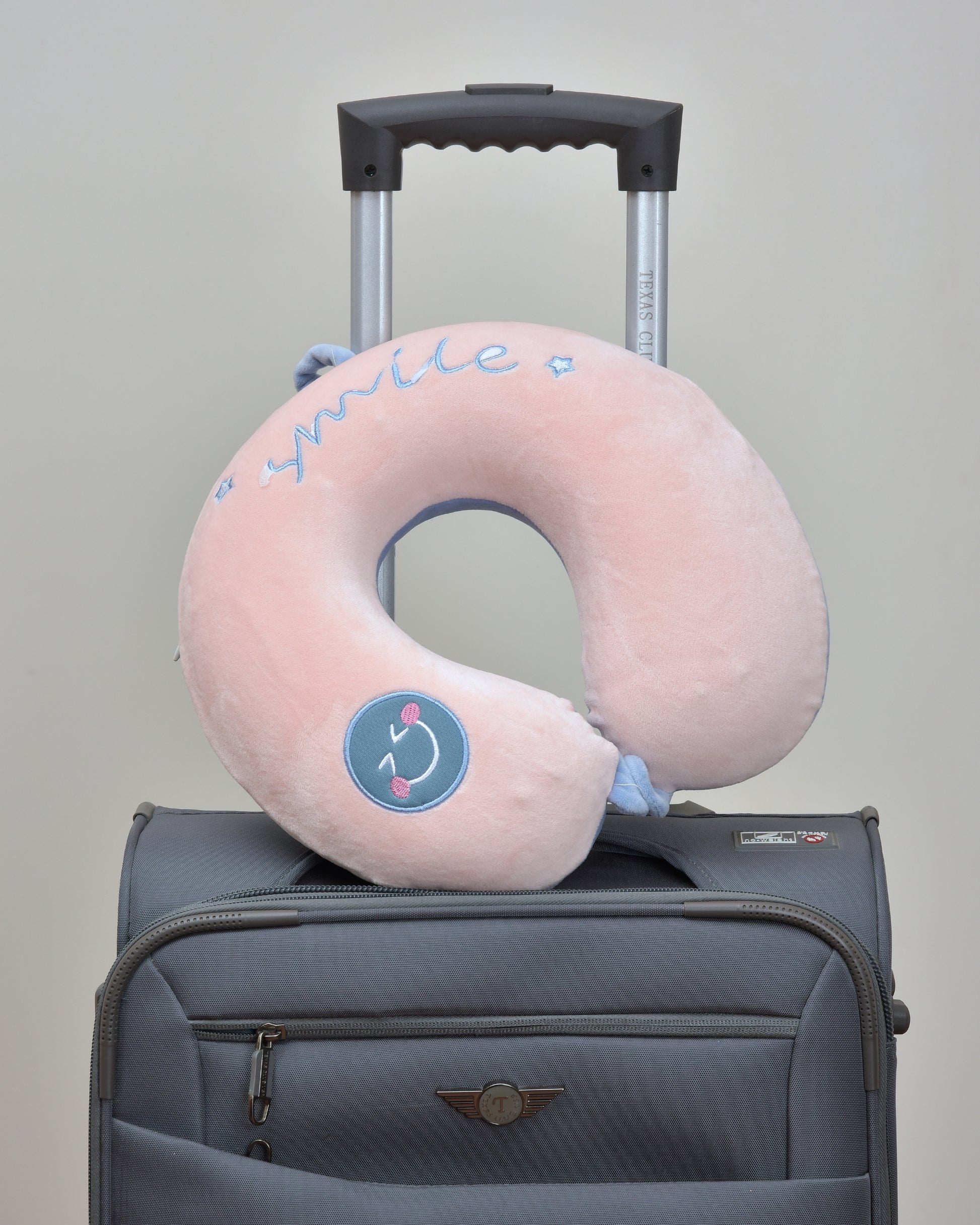 Cushy® Travel Neck Pillow with 360-Degree Head Support - Memory Foam Luxury Soft Pillow for Sleeping Rest - Home Travel Airplane Car - Smiley Printed, Pink & Blue
