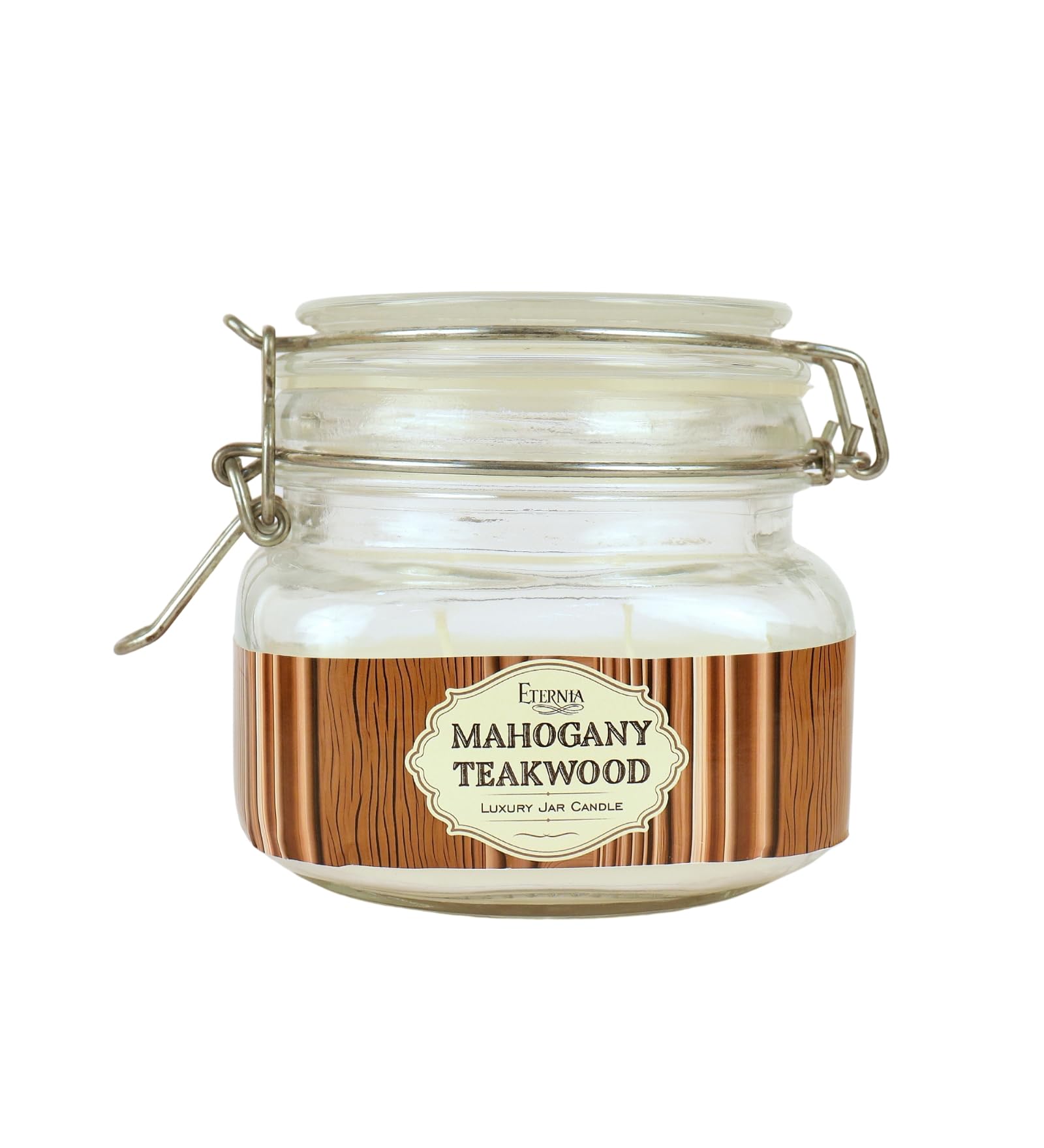 Eternia® Mahogany Teakwood Scented Double Wick Jar Candle – Rich Woody Aroma for a Cozy, Refined Ambience – Jar Candle for Living Room or Office – 28 Hours Burn Time