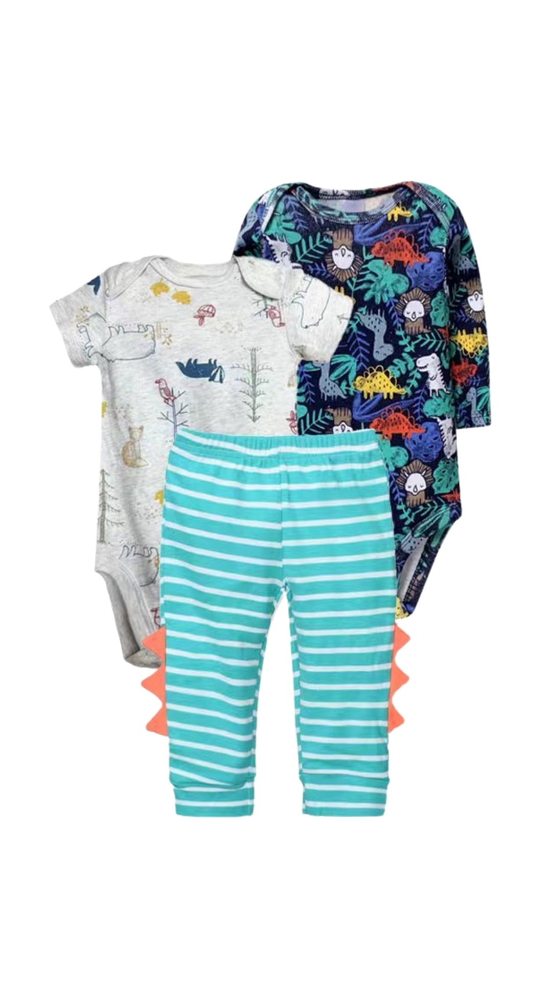 Let your little explorer stomp in style with this adorable 3-piece baby boys’ outfit! Featuring a jungle-themed long sleeve bodysuit, a cute animal-print short sleeve bodysuit, and striped pants with playful dinosaur spikes—this set is made from soft, breathable cotton for all-day comfort and fun.