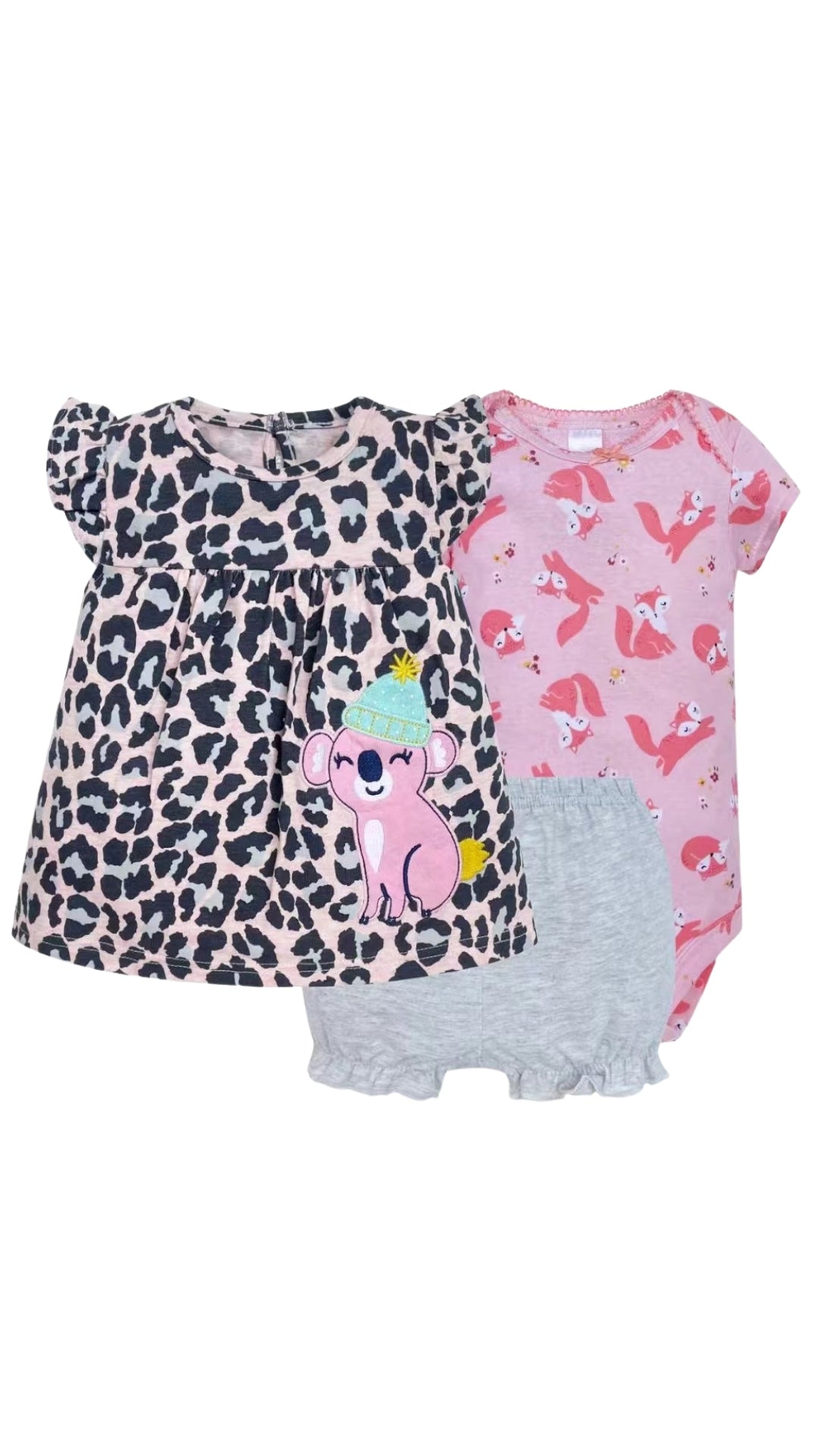 Dress your little one in wild summer style with this adorable 3-piece outfit set featuring a pink leopard print dress with a koala appliqué, a fox-print bodysuit, and soft grey ruffle shorts – perfect for warm weather fun!