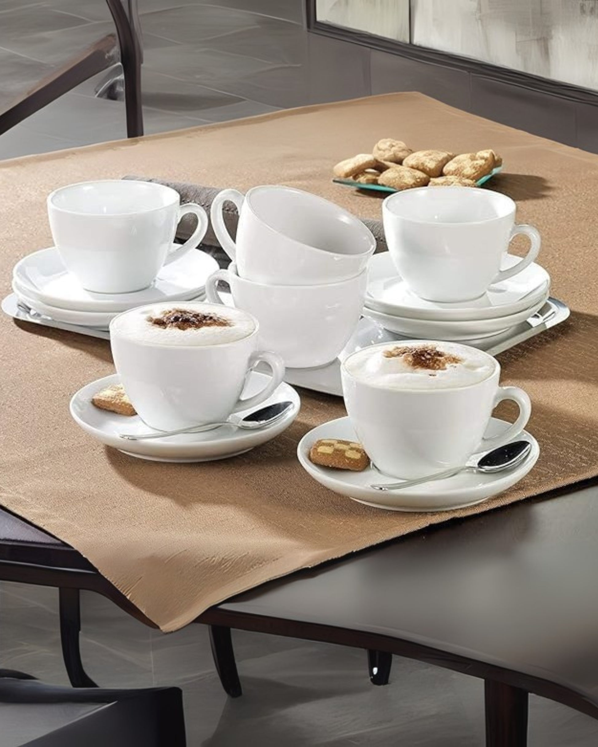 Enjoy your favorite hot beverages in style with Premsons® Ceramic Coffee Cups with Saucers. This elegant set of 6 is perfect for daily tea or coffee moments at home, the office, or while entertaining guests.