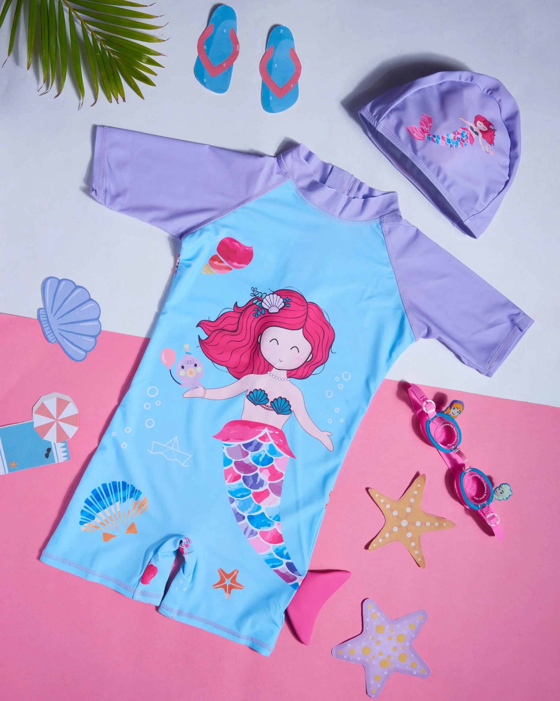 Premsons® Children's One-Piece Swimwear – Half Sleeve & Shorts Length Swimming Costume with Matching Cap - Mermaid - Blue & Purple