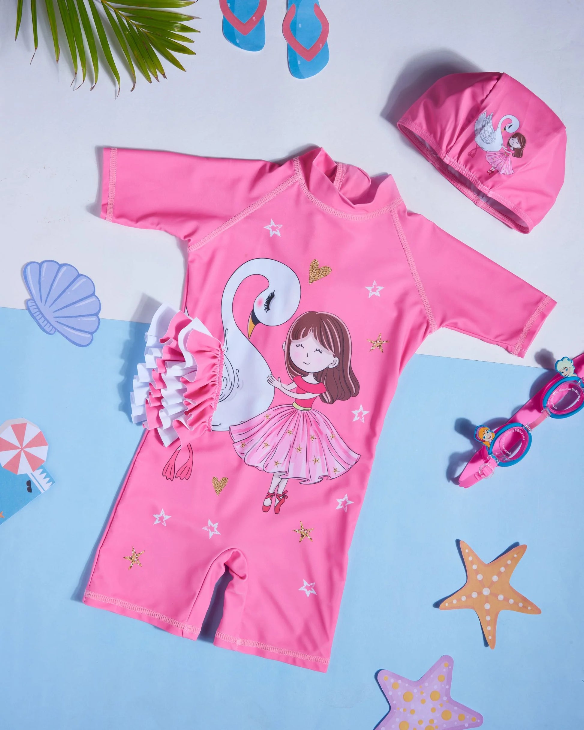 Premsons® Children's One-Piece Swimwear – Half Sleeve & Shorts Length Swimming Costume with Matching Cap - Swan Lake
