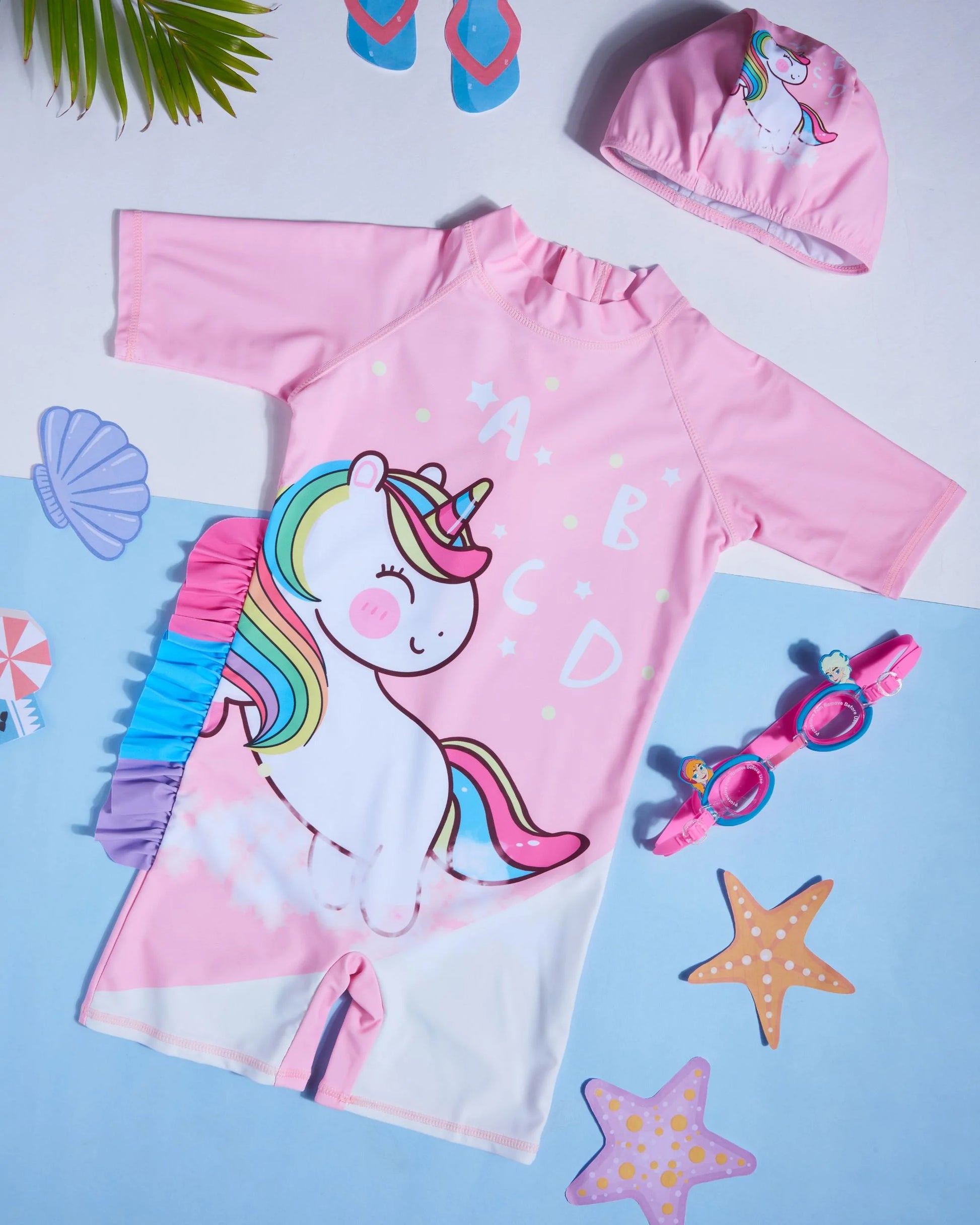 Premsons® Children's One-Piece Swimwear – Half Sleeve & Shorts Length Swimming Costume with Matching Cap - Unicorn - Light Pink