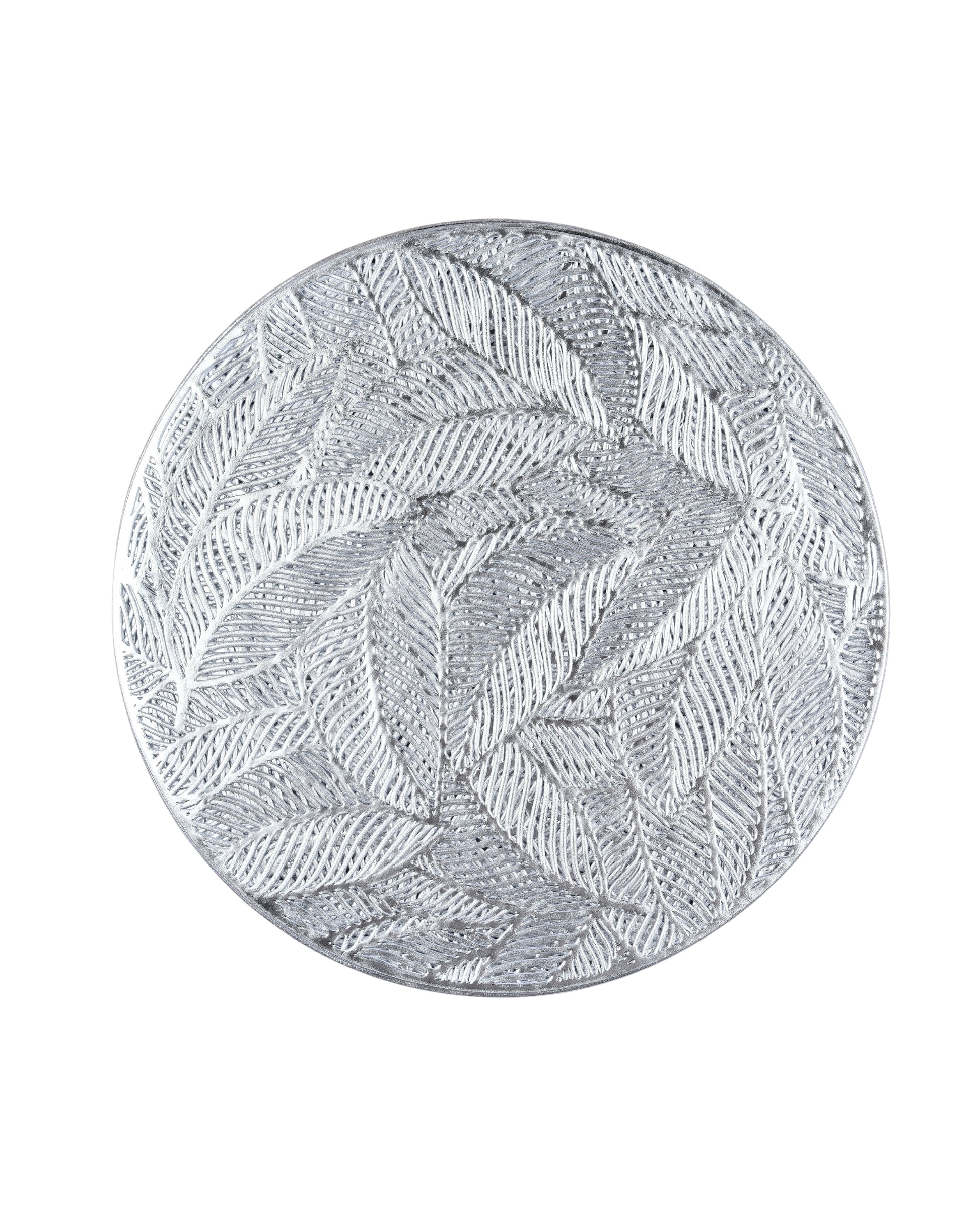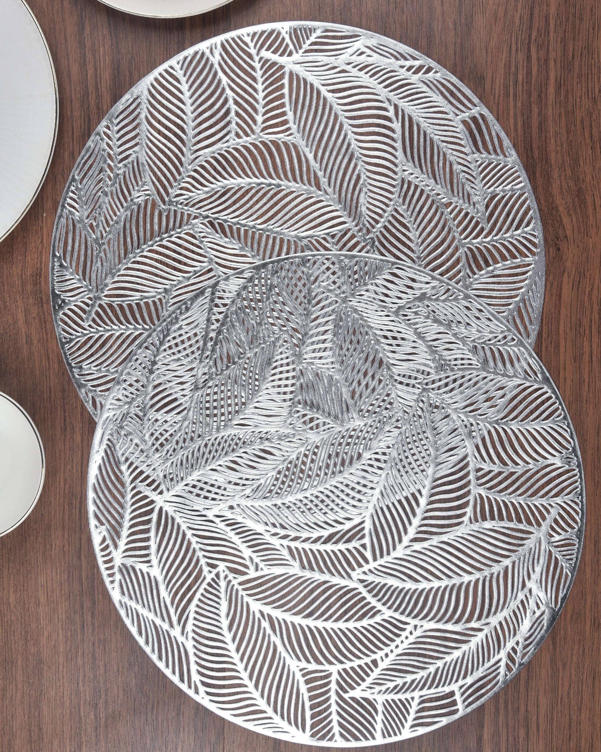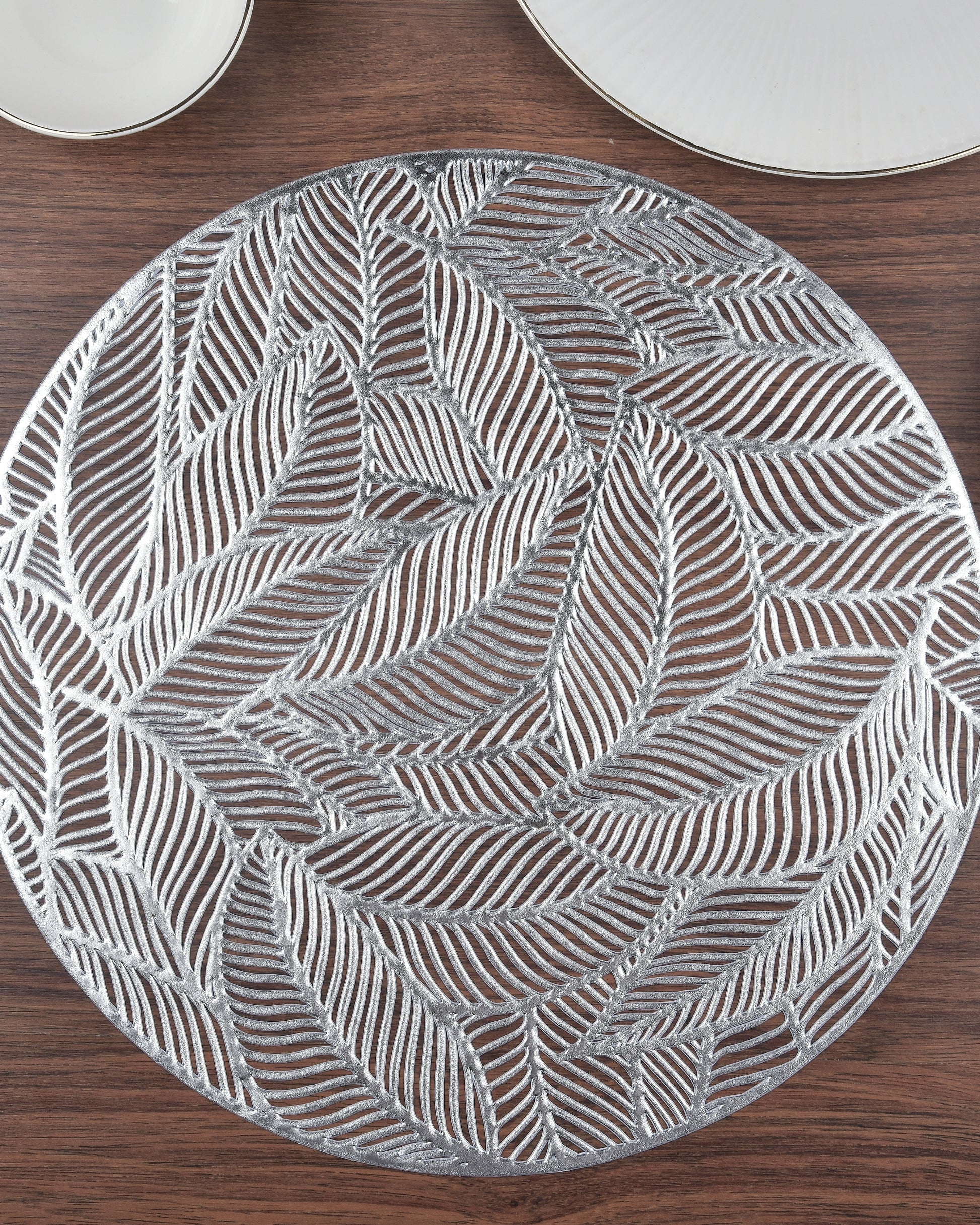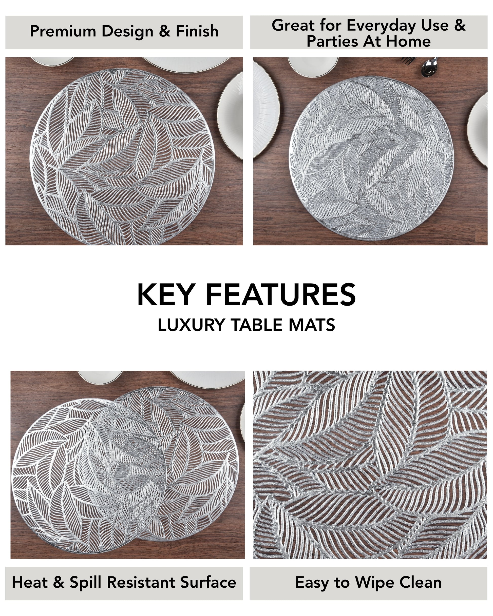 Premsons® Round Table Mat – Elegant Metallic Leaf Placemat | Washable, Wipeable, Non-Slip & Heat-Resistant | Dining Table Mat for Kitchen, Wedding & Party Décor – Silve