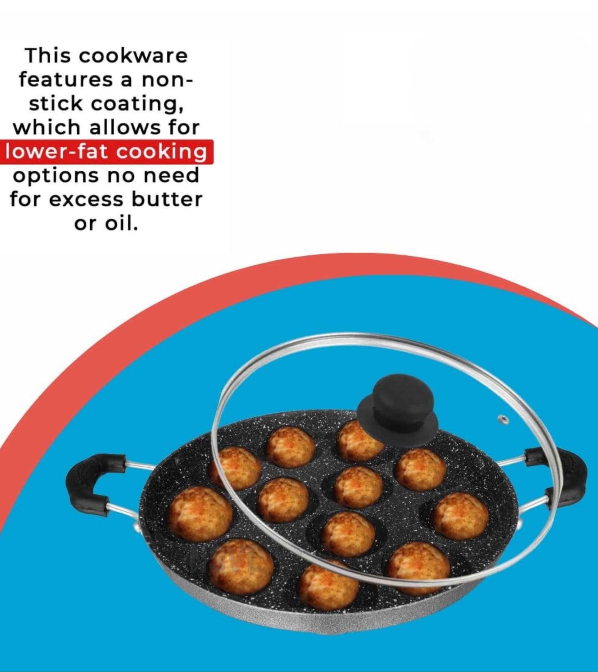 Premsons® Heavy-Base Non-Stick Appam Patra with 12 cavities and a glass lid is perfect for making delicious appams, littis, and more. Designed for even cooking on gas stoves, this pan ensures a mess-free, oil-efficient cooking experience.