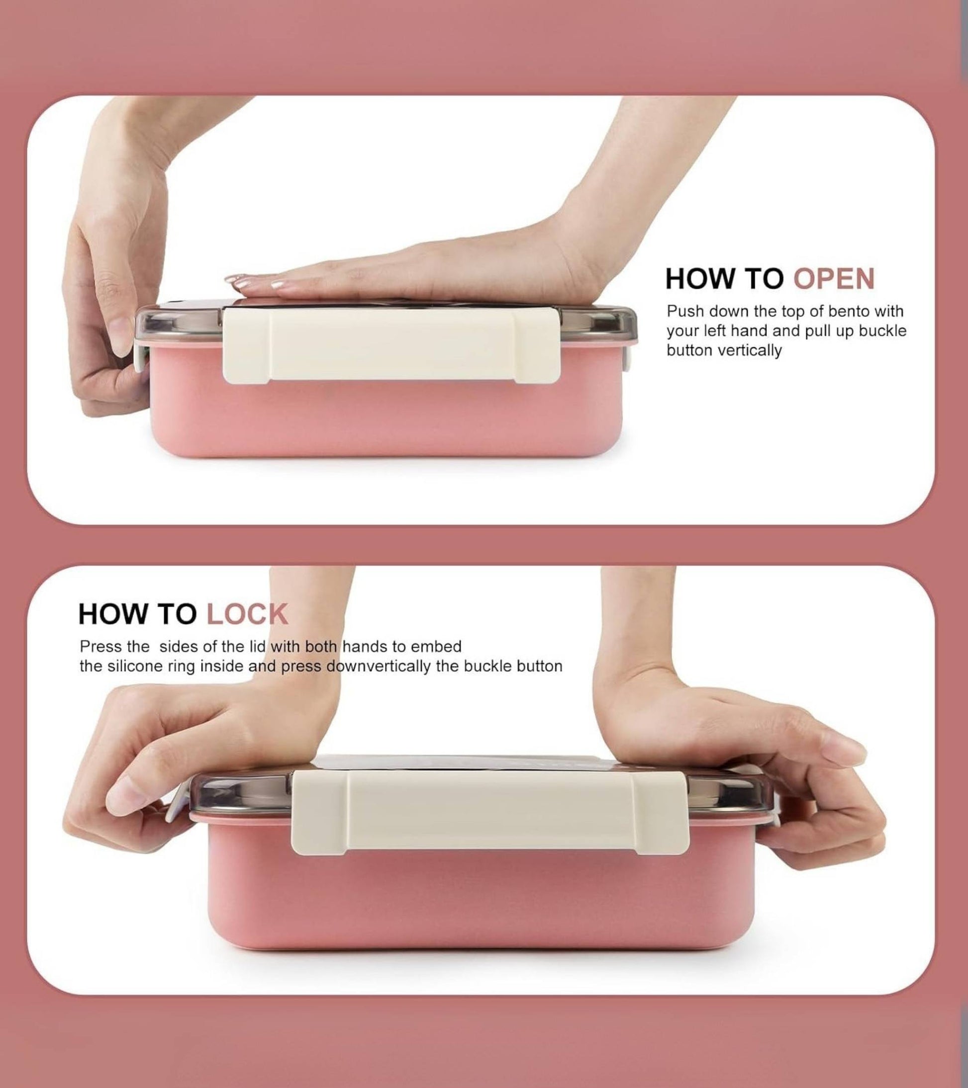 Durable and rust-resistant food-grade stainless steel tray with three sections allows you to neatly separate main dishes, fruits, and snacks — keeping food fresh and organized.