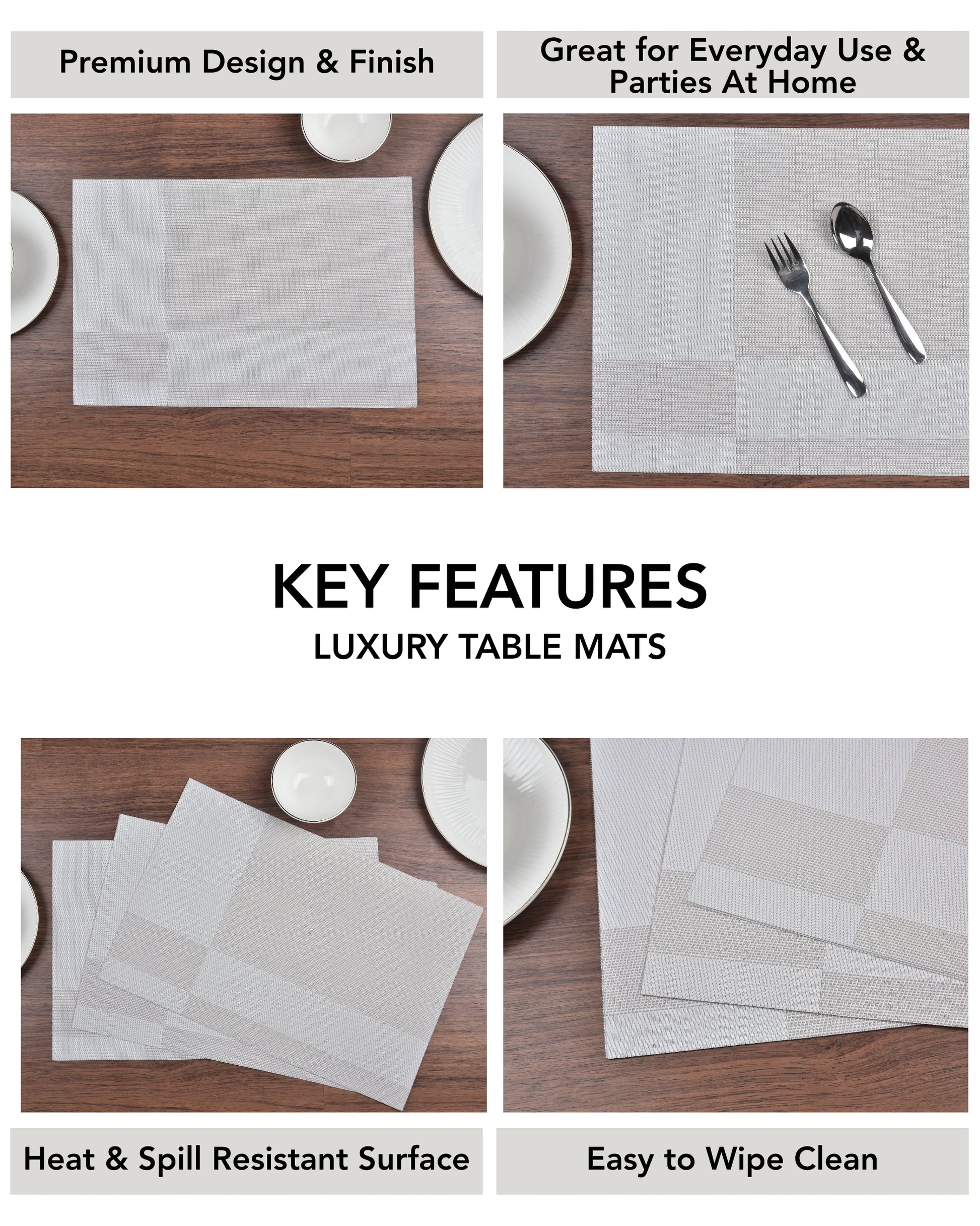 Premsons® Grey Rectangle Metallic Placemats – Washable, Wipeable, Non-Slip & Stain-Resistant Table Mats for Dining, Kitchen, Wedding & Party Décor