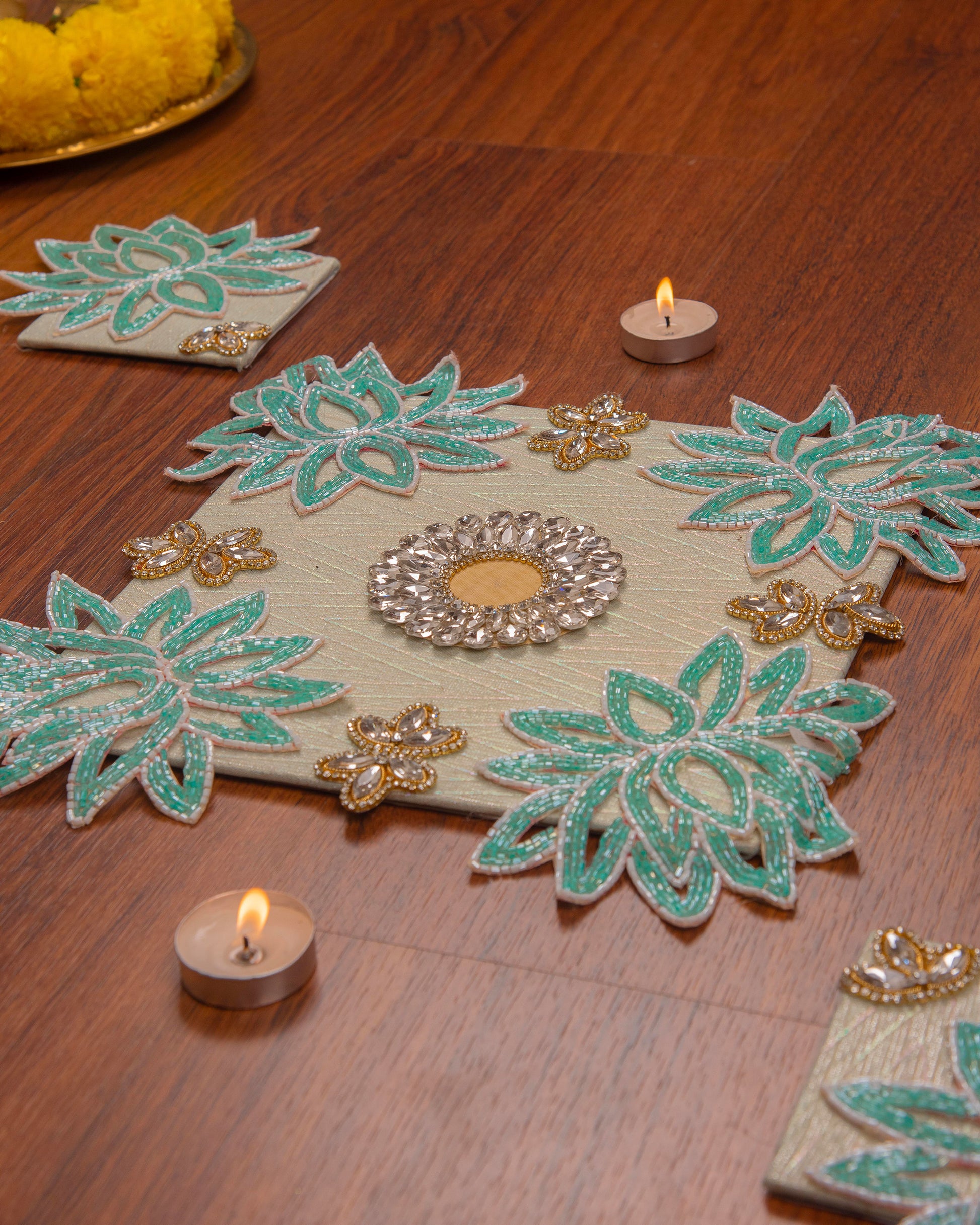 Premsons® Readymade Blue Beaded Rangoli Set of 5 – Decorative Floor Art for Diwali, Pooja & Festive Home Décor