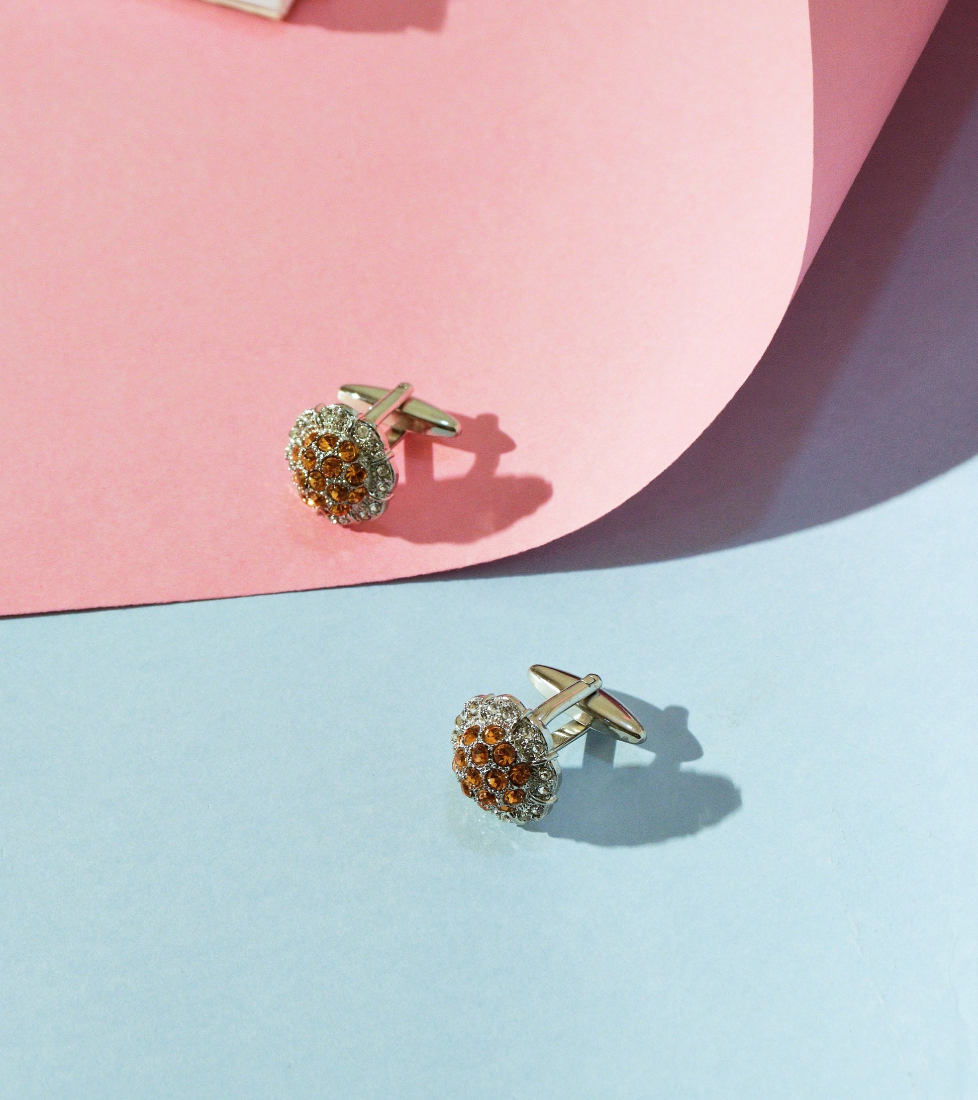 Premsons® Floral Cluster Cufflinks – Round Silver-Tone Design with Orange & Clear Crystal Accents for Ethnic and Formal Wear