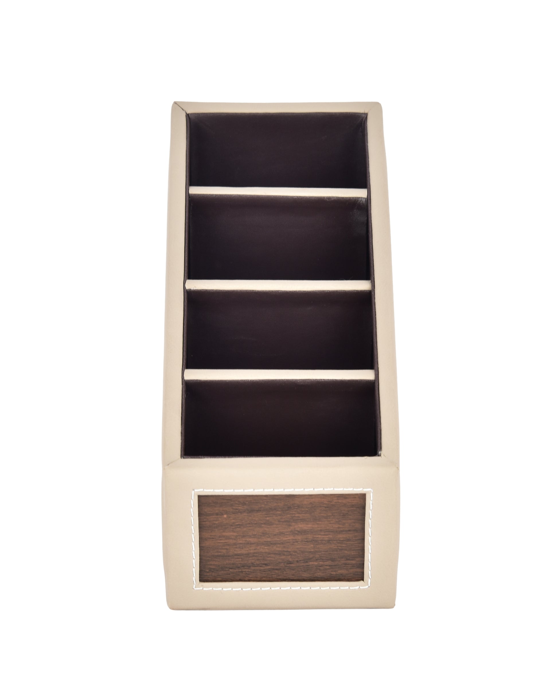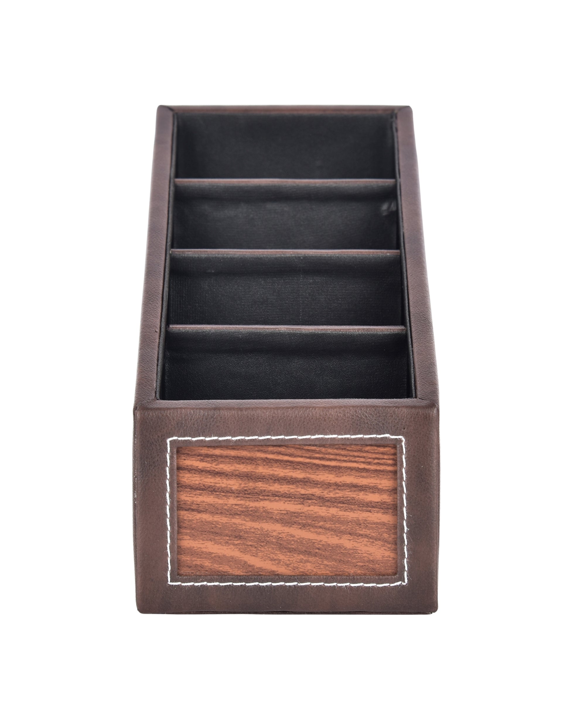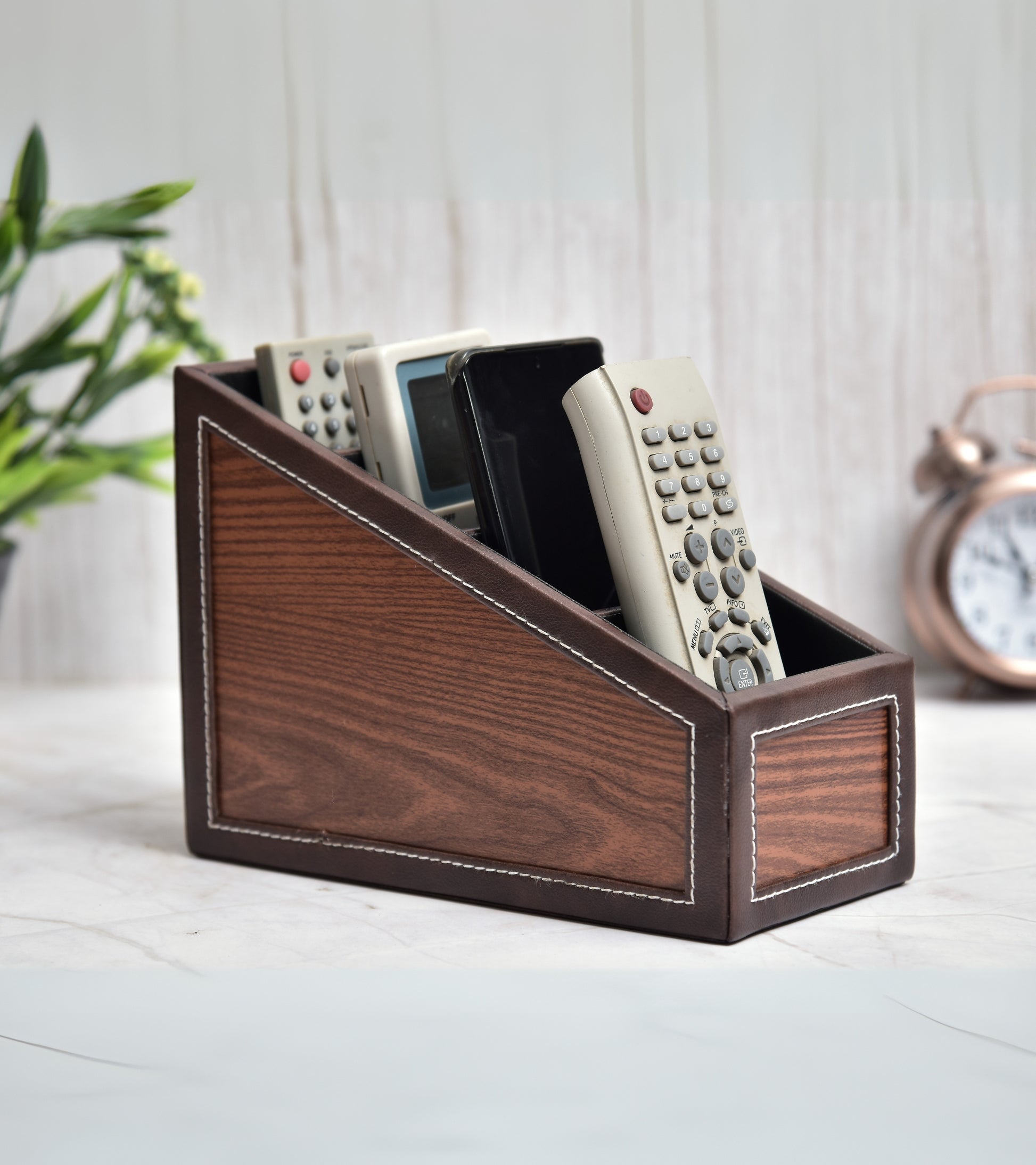 Declutter your space with the Premsons® Remote Holder featuring 4 spacious sections. Crafted from premium artificial leather with a refined wooden finish, this tabletop organizer is ideal for keeping TV remotes, AC remotes, phones, pens, and office supplies neatly arranged. A perfect blend of style and utility for your home or workplace.
