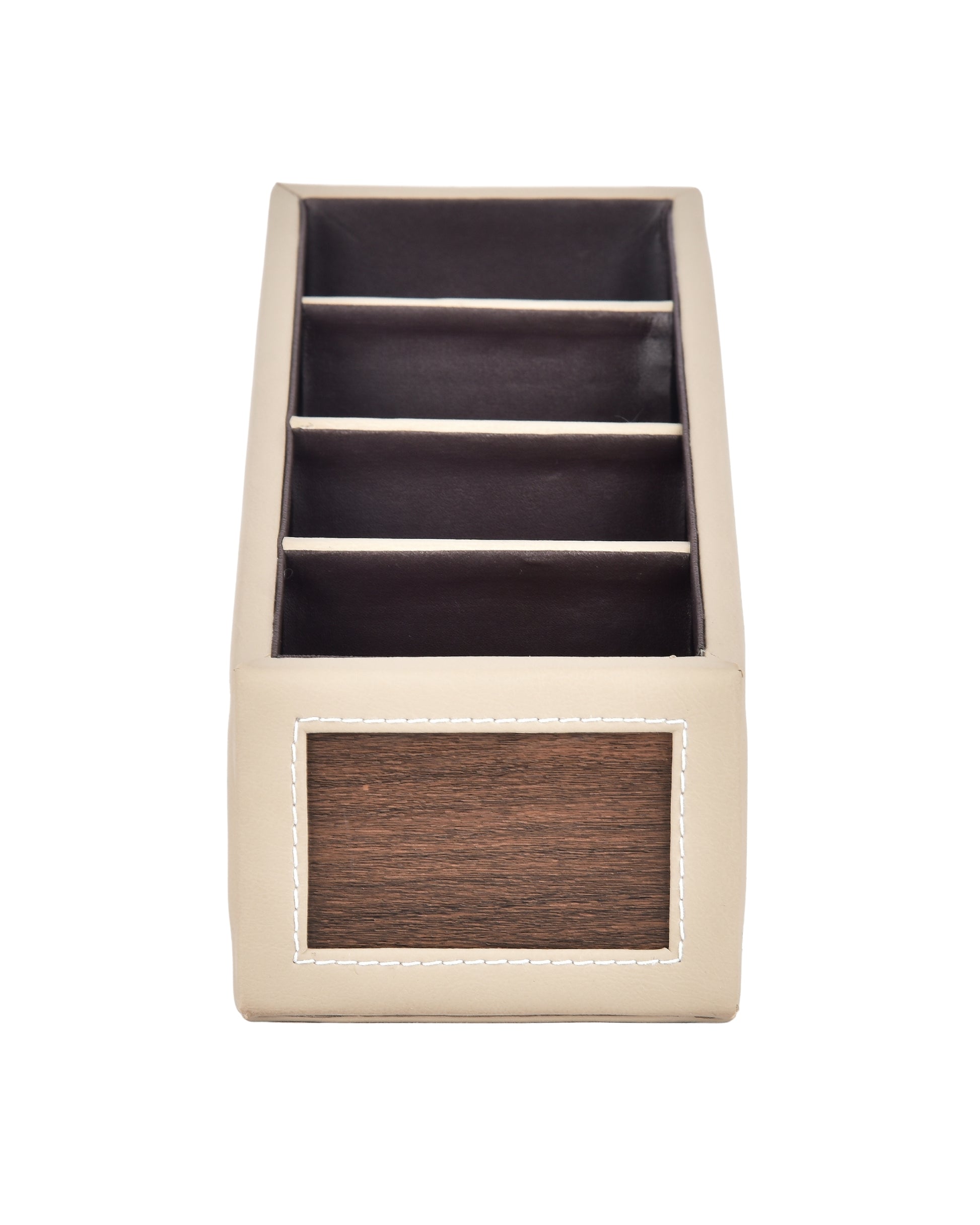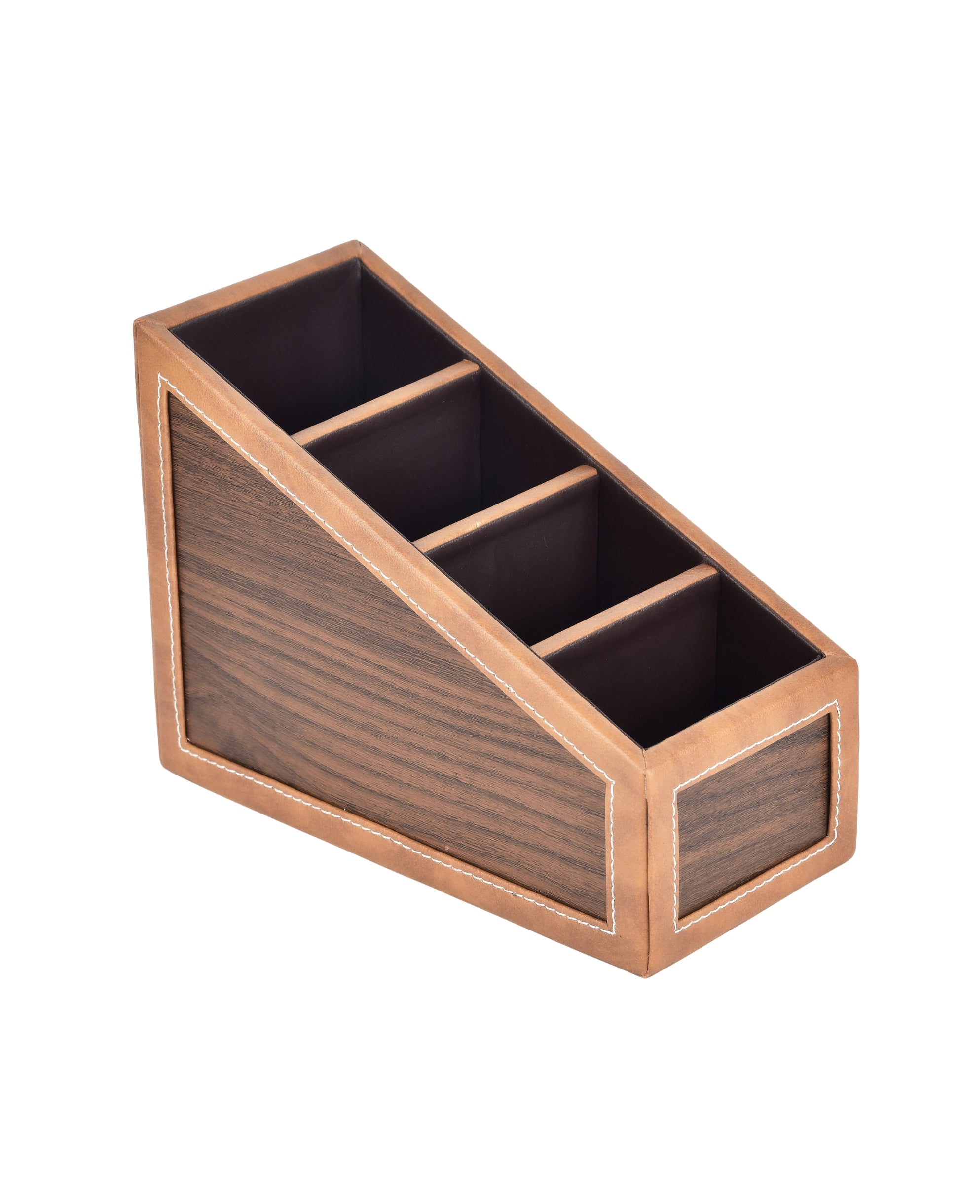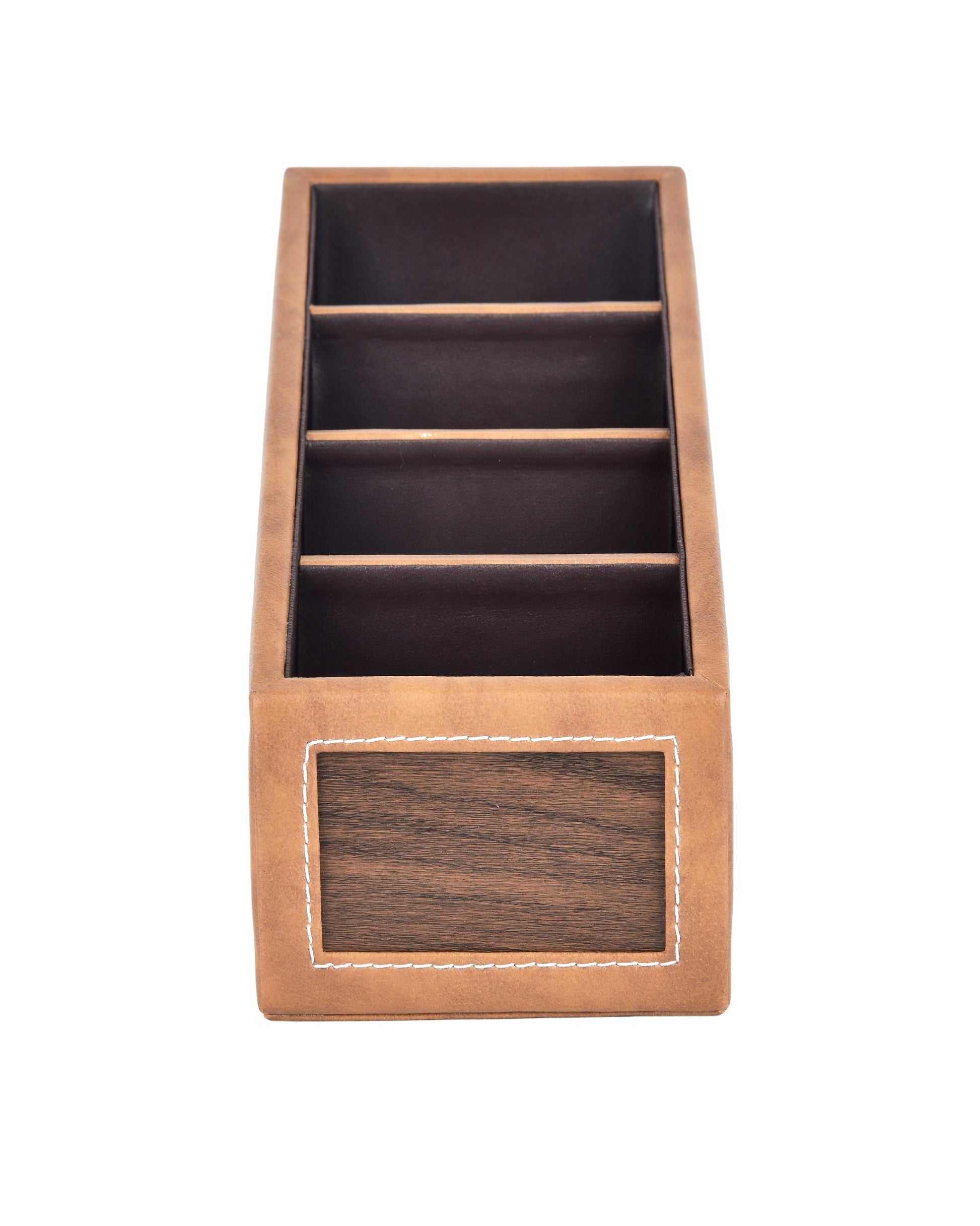 Declutter your space with the Premsons® Remote Holder featuring 4 spacious sections. Crafted from premium artificial leather with a refined wooden finish, this tabletop organizer is ideal for keeping TV remotes, AC remotes, phones, pens, and office supplies neatly arranged. A perfect blend of style and utility for your home or workplace.