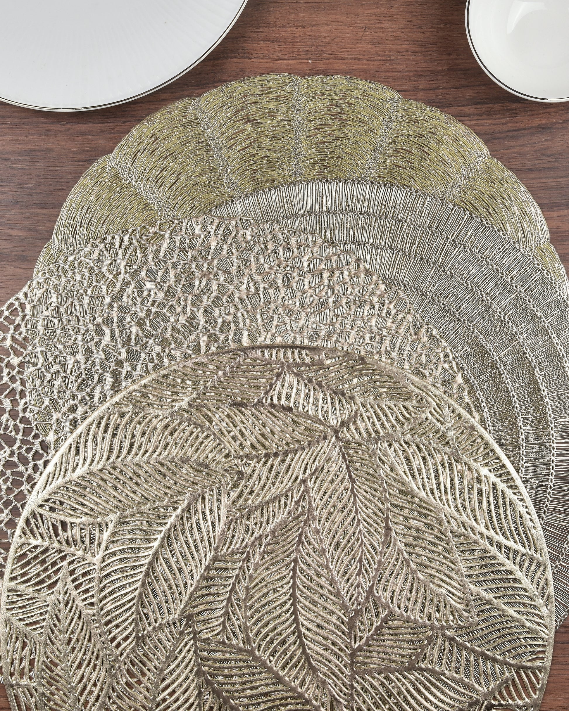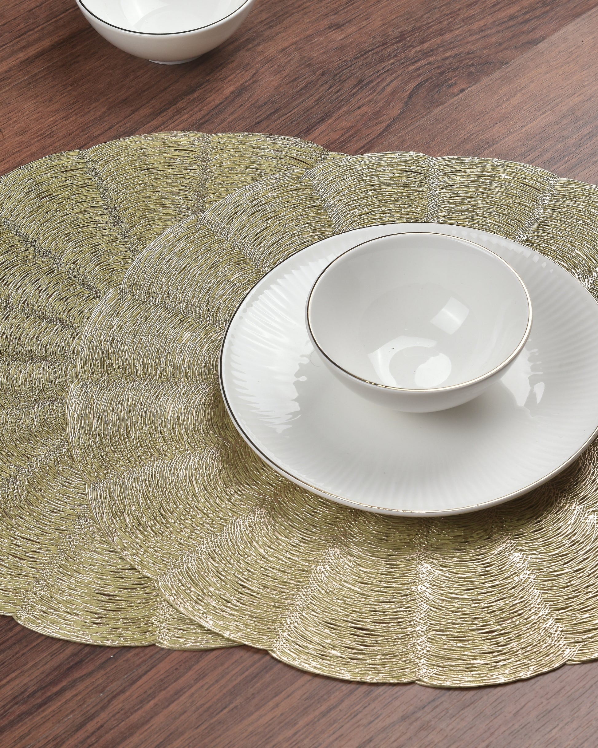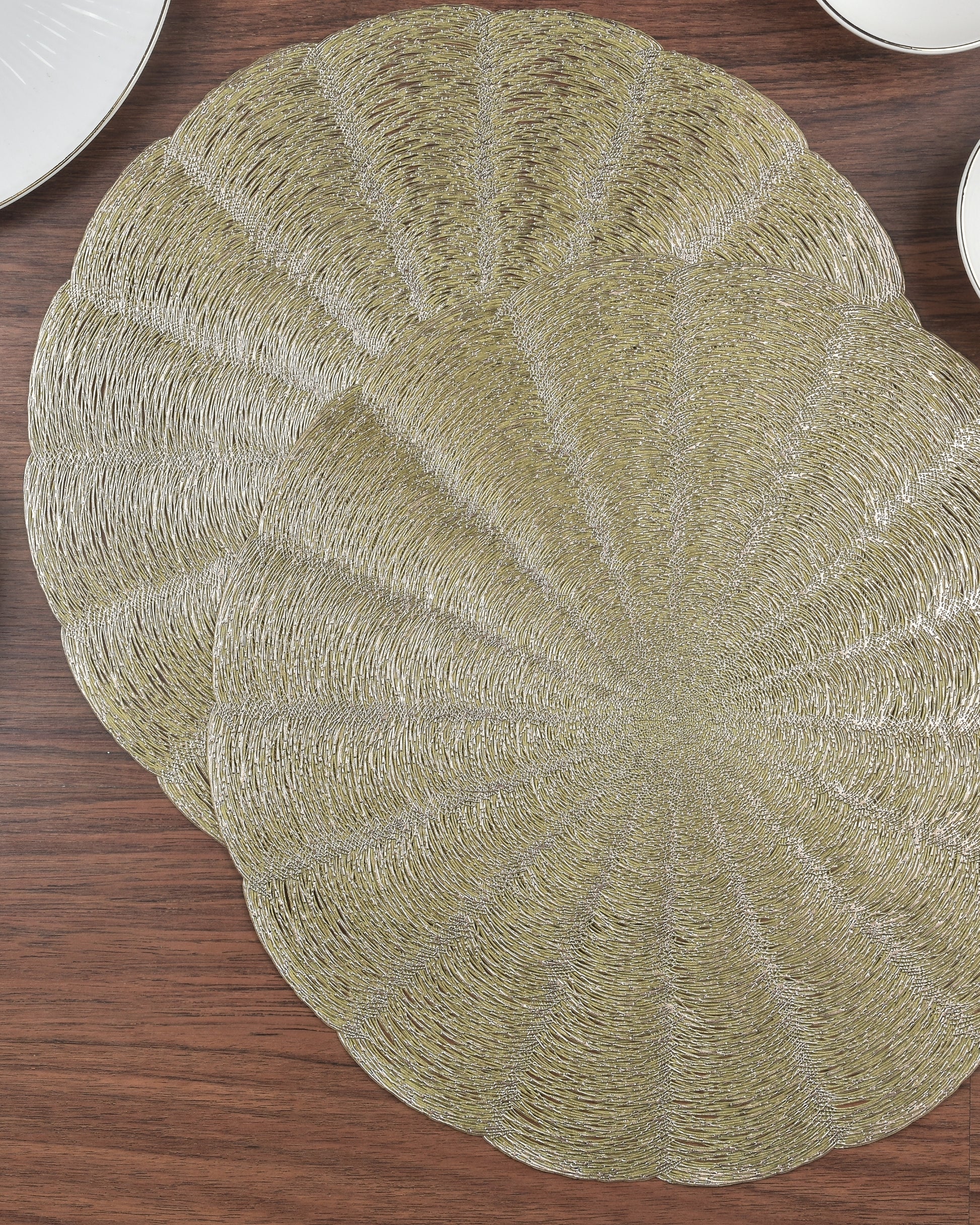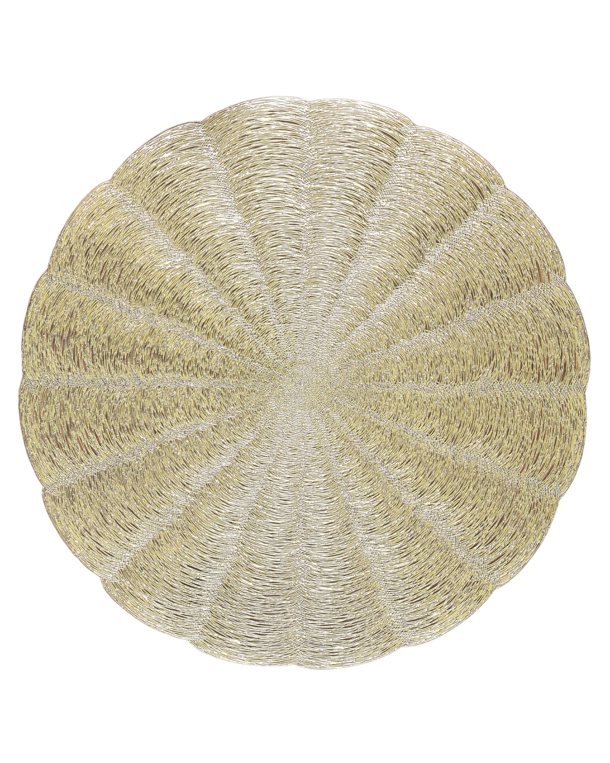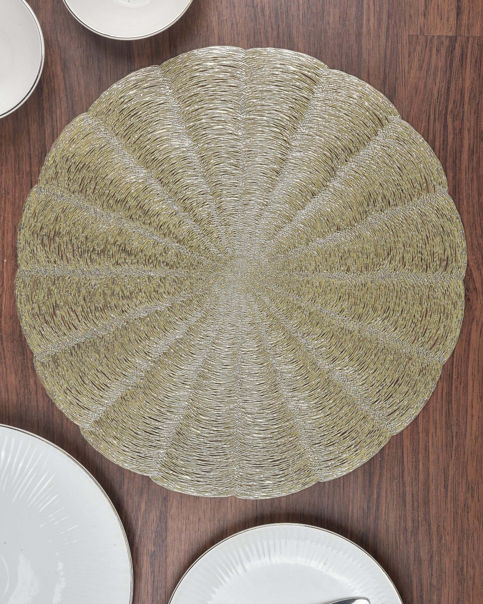 Bring charm to your table with Premsons® Floral Scalloped Round Placemat in a striking Gold-Silver blend – a perfect blend of elegance and functionality for any festive or daily setup.