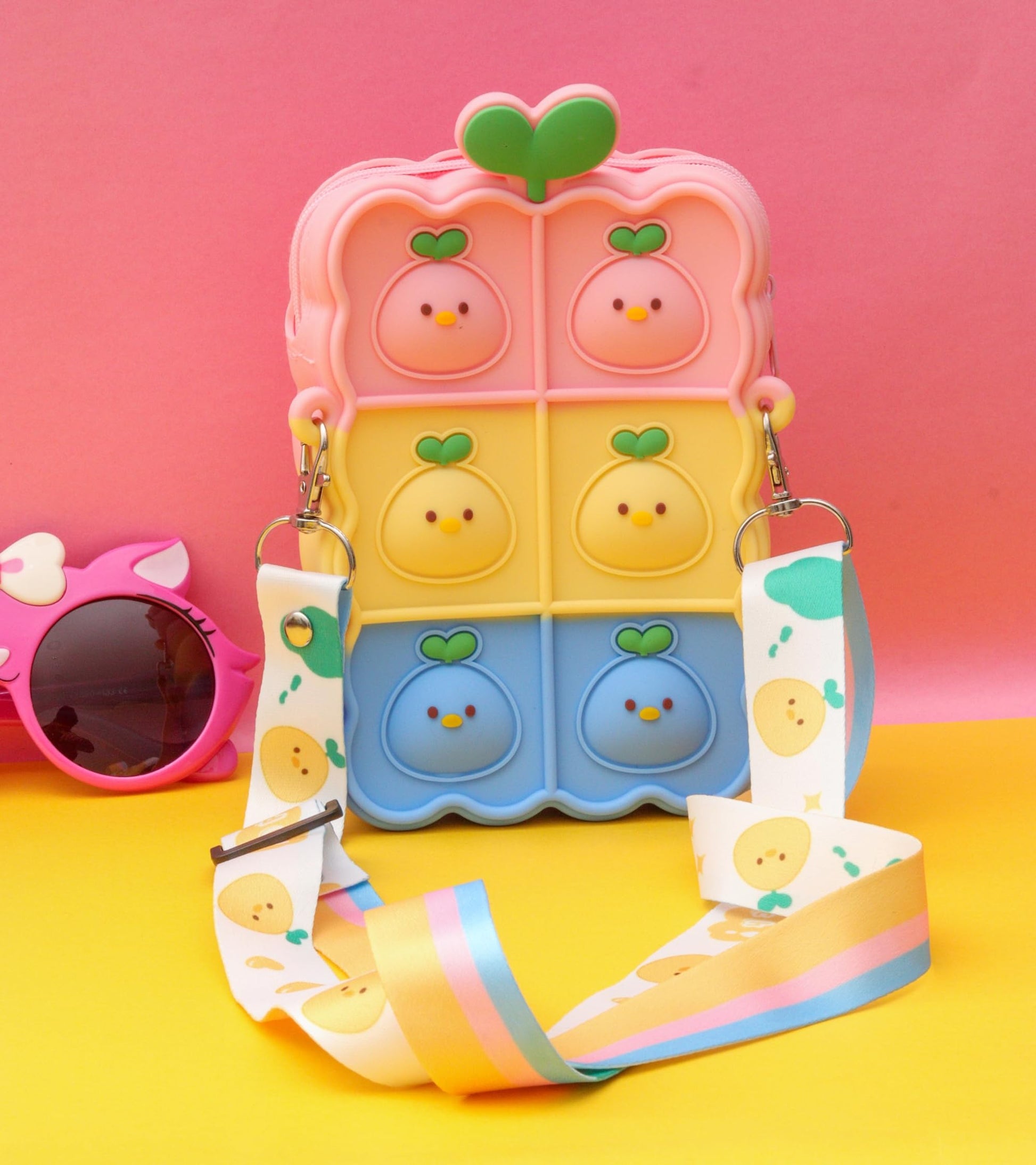 Premsons® Silicone Pop It Sling Bag for Kids – Fun & Functional Mobile Holder with Sensory Fidget Design | Crossbody Bag - (Pink,Yellow & Blue)