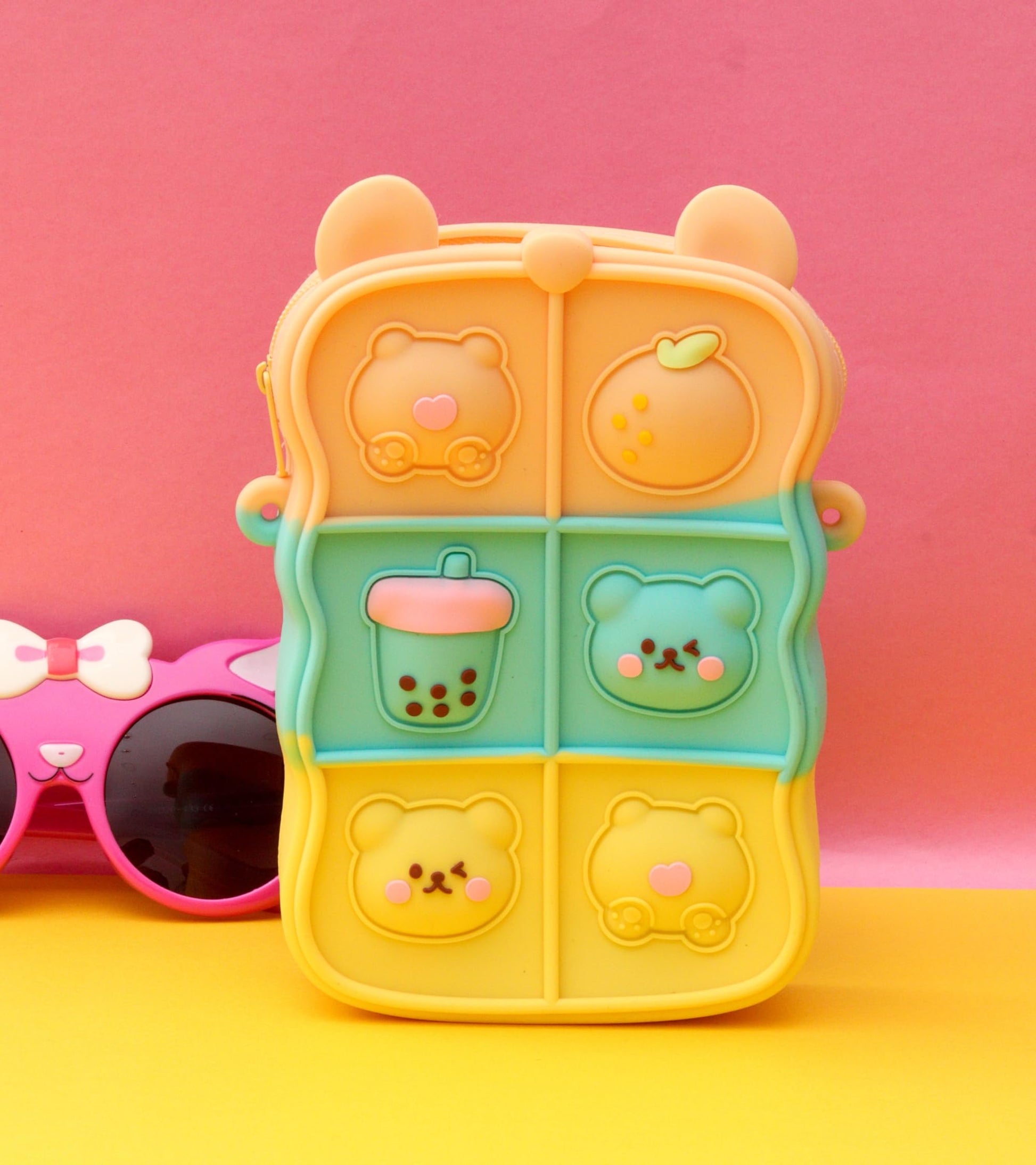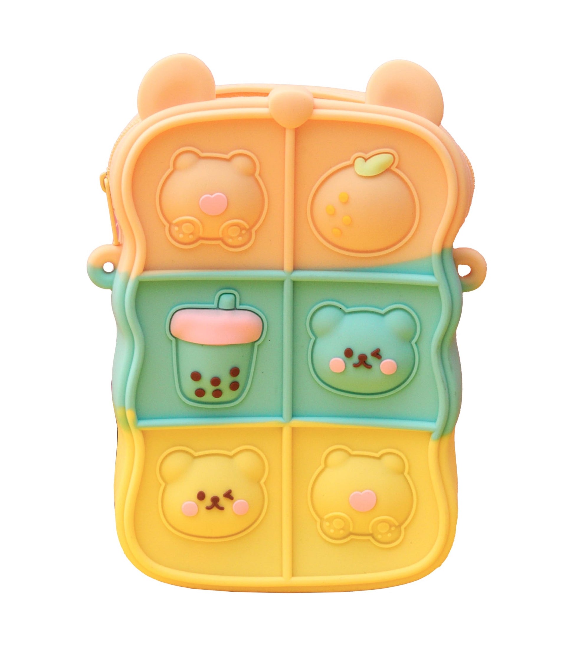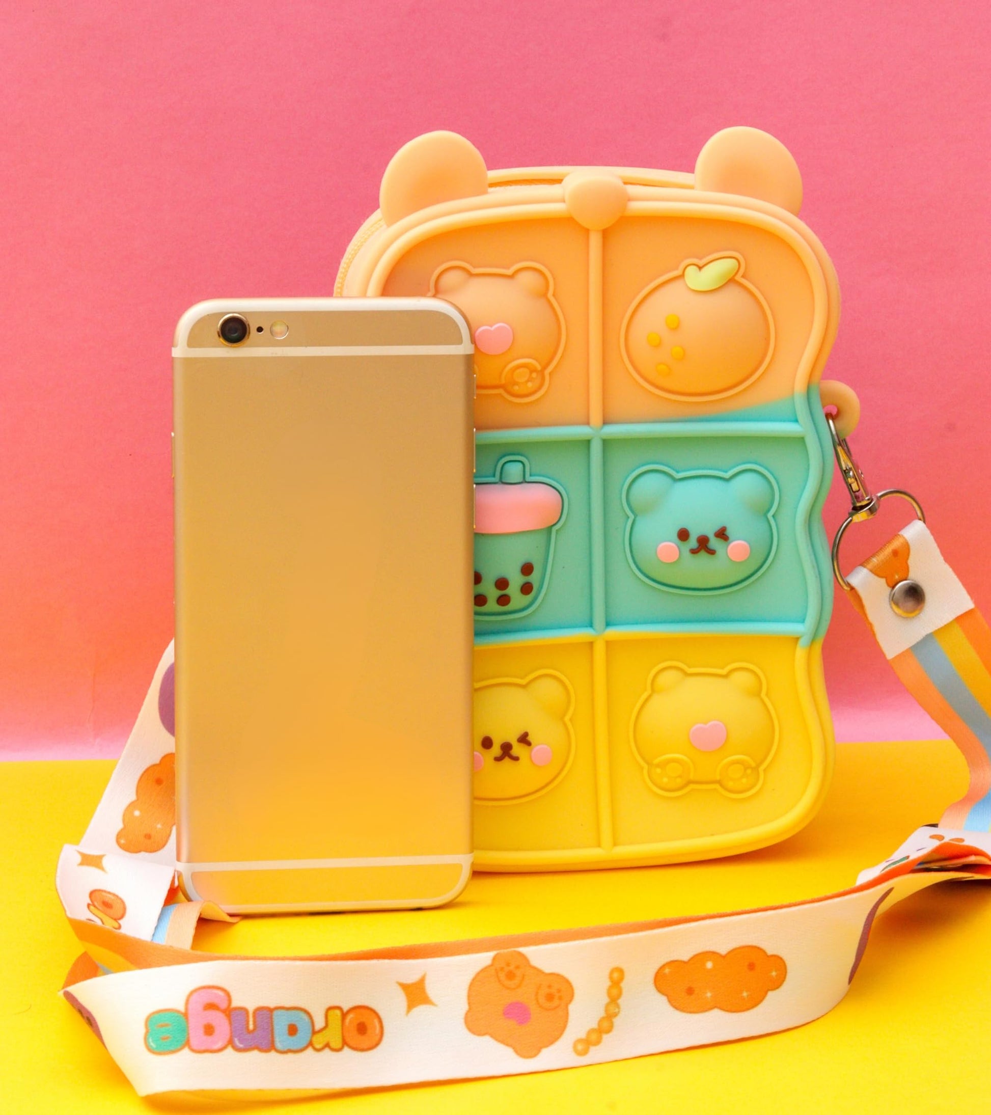 Premsons® Silicone Pop It Sling Bag for Kids – Fun & Functional Mobile Holder with Sensory Fidget Design | Crossbody Bag - (Orange, Blue & Yellow)