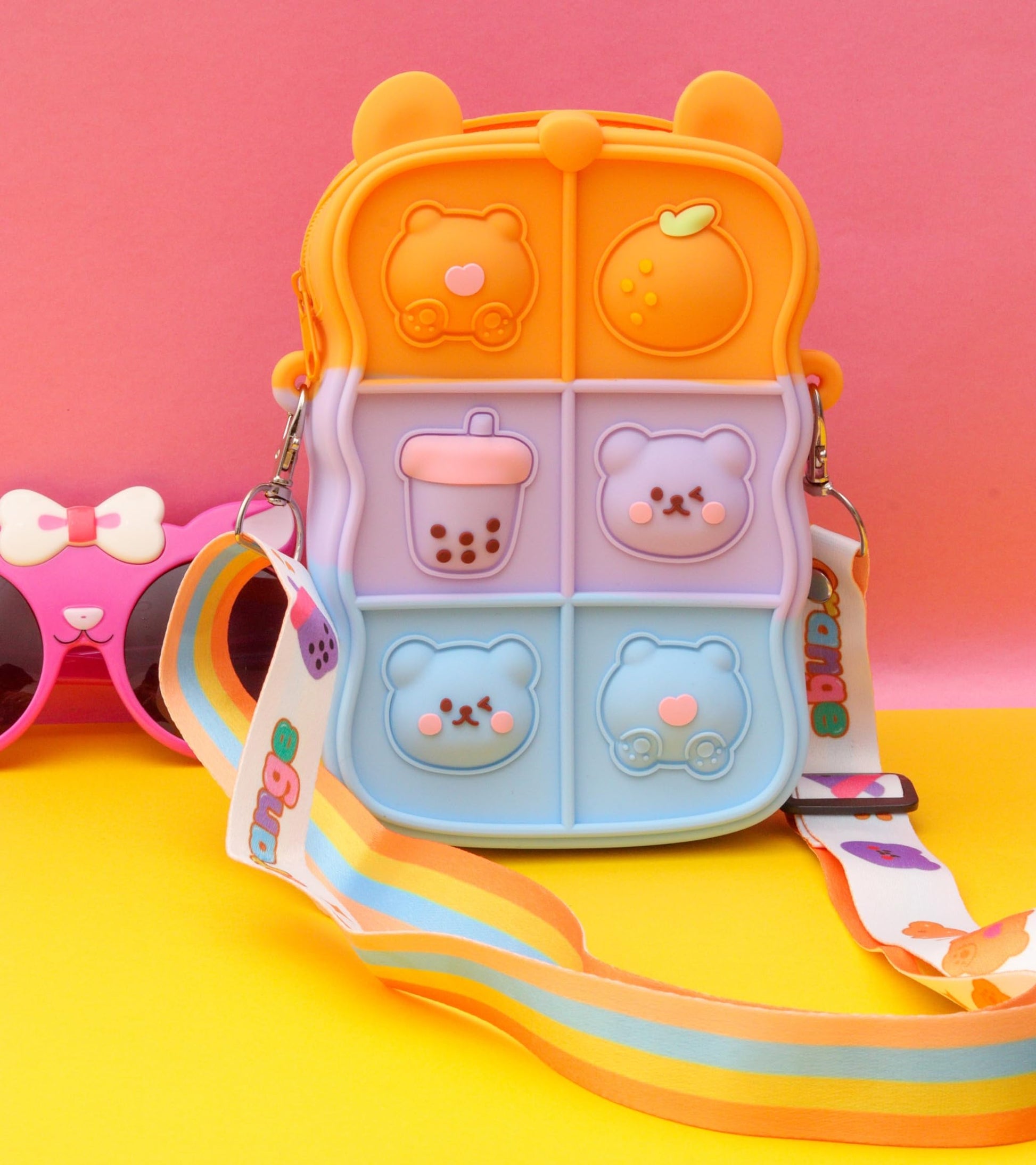 Premsons® Silicone Pop It Sling Bag for Kids – Fun & Functional Mobile Holder with Sensory Fidget Design | Crossbody Bag - (Orange, Purple, Blue)