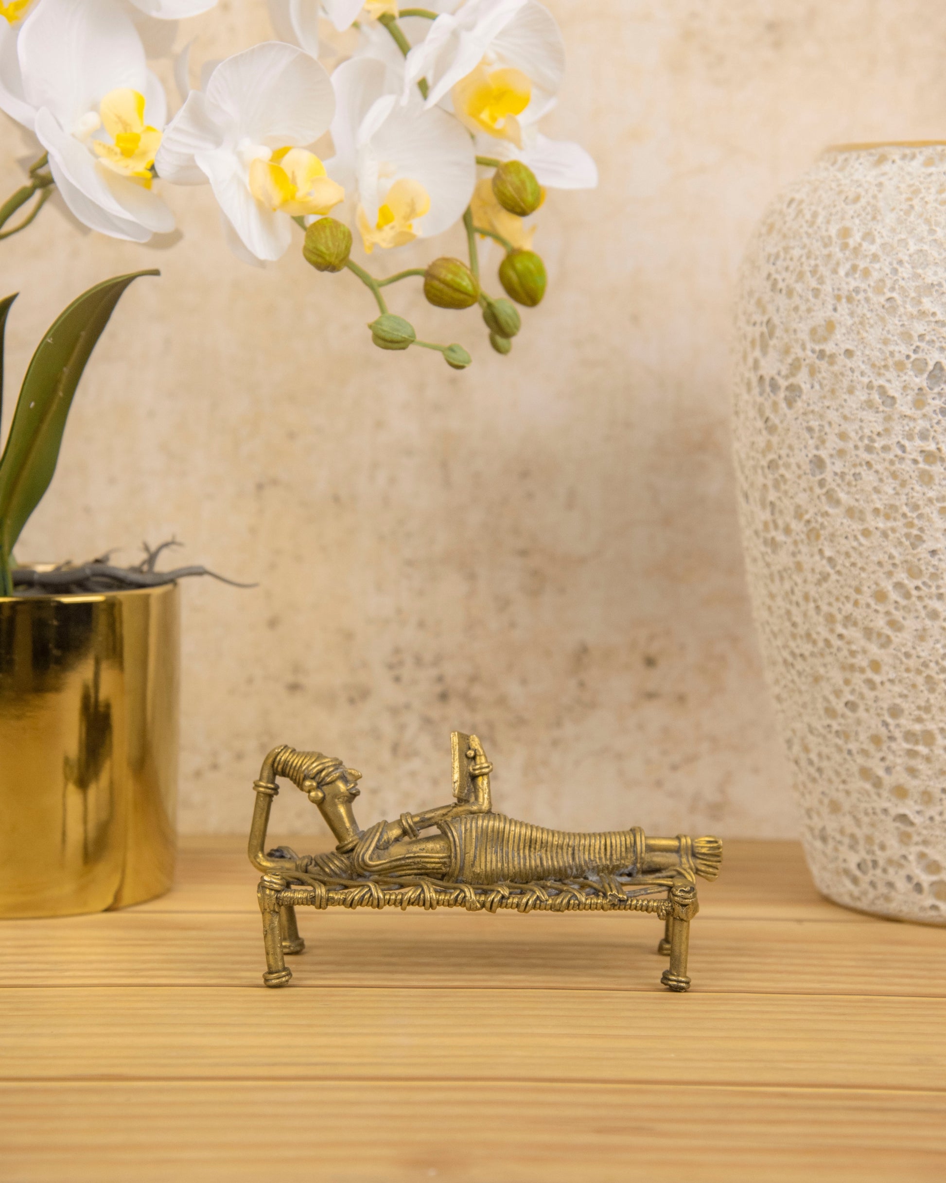 Premsons® Tribal Lady Reading Book Sleeping on Cot | Handcrafted Dhokra Craft Brass Figurine for Home & Office Décor