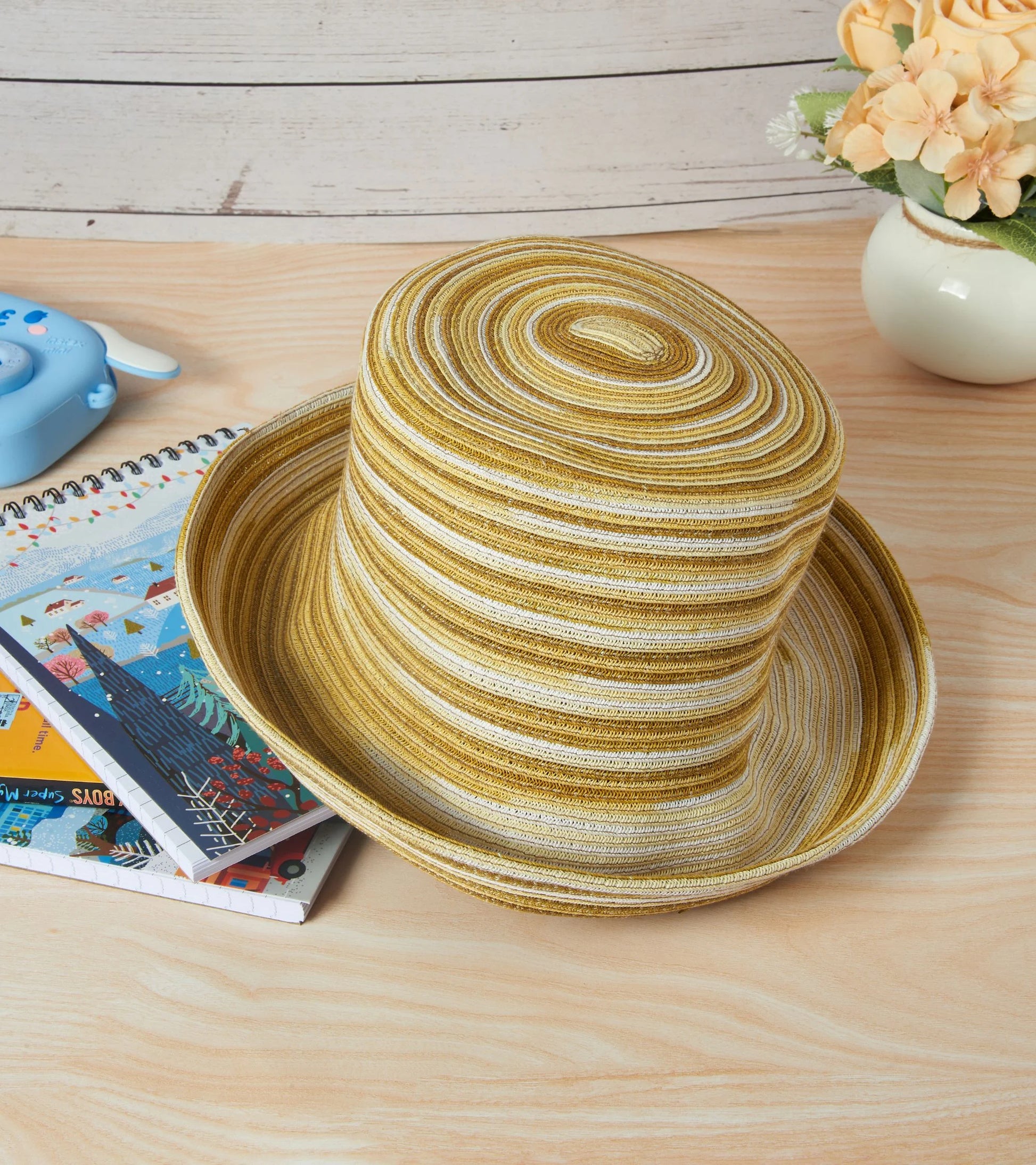 Premsons® Wide-Brimmed Striped Straw Hat for Ladies – Mustard & Beige