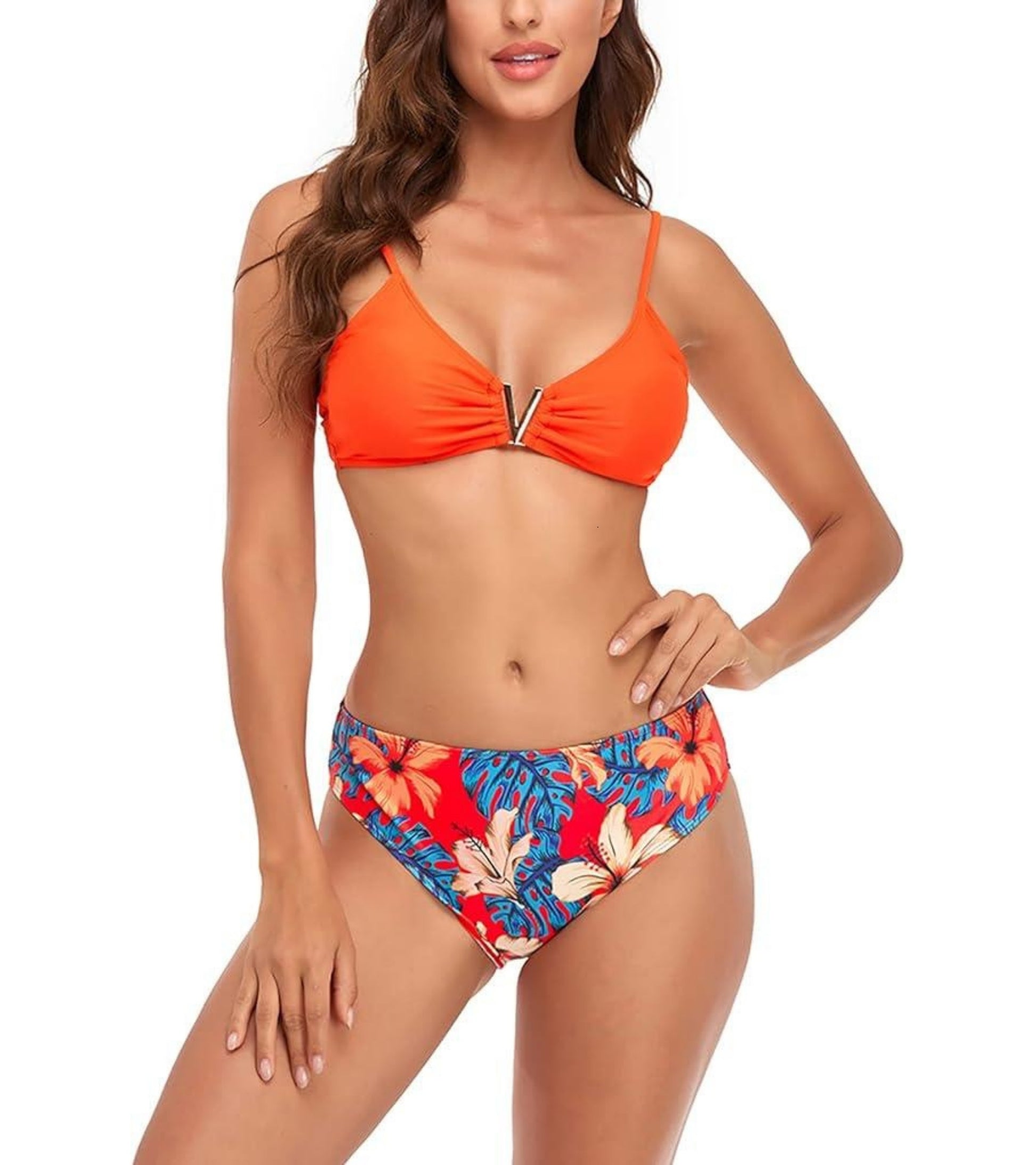 👙 Chic Design: Bold tropical floral prints with a sleek V-notch bikini top for a modern, eye-catching finish