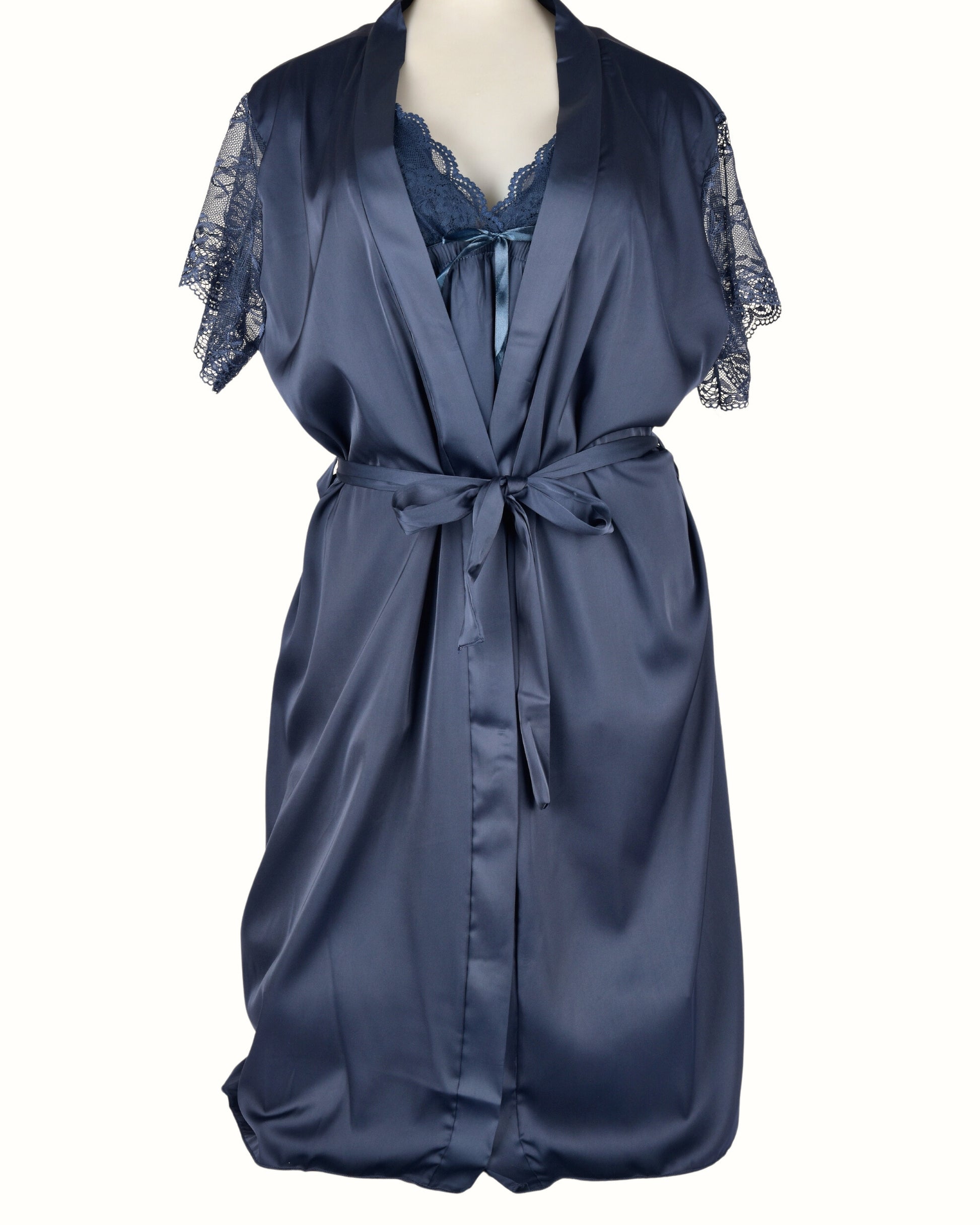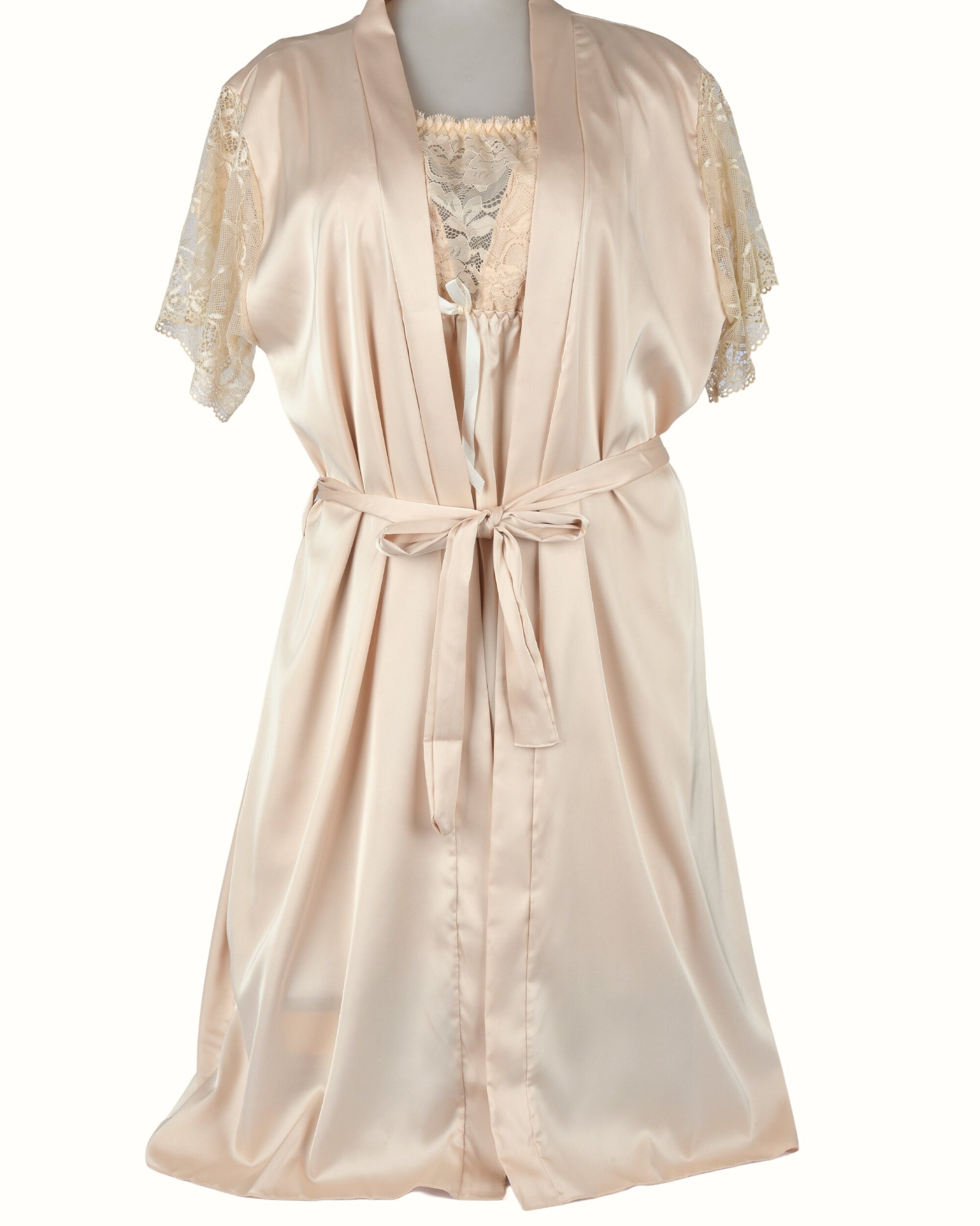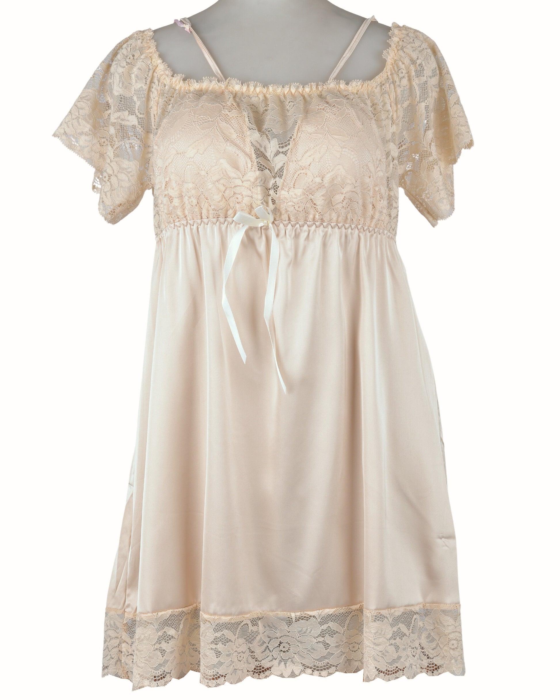 This graceful short-sleeve nightdress features a silky satin body paired with delicate floral lace detailing at the sleeves, neckline, and hem. The flattering empire waistline is adorned with a charming satin bow, while the soft fabric glides gently over your skin, making it ideal for a restful night or relaxed lounging at home.