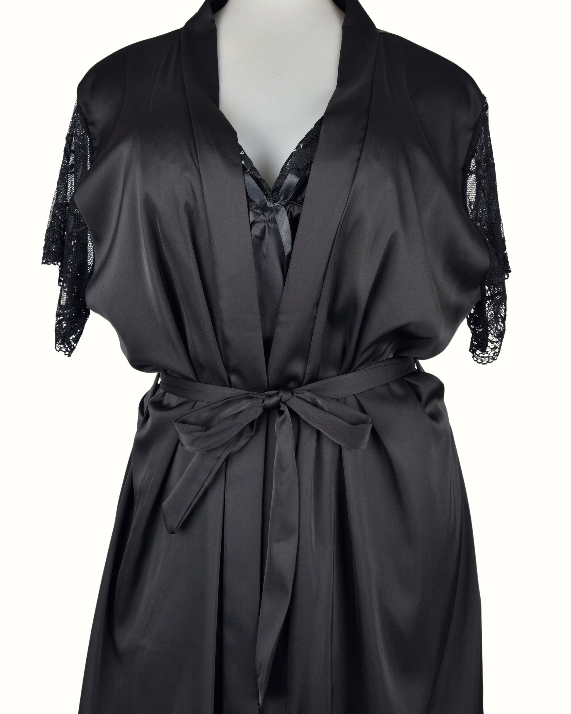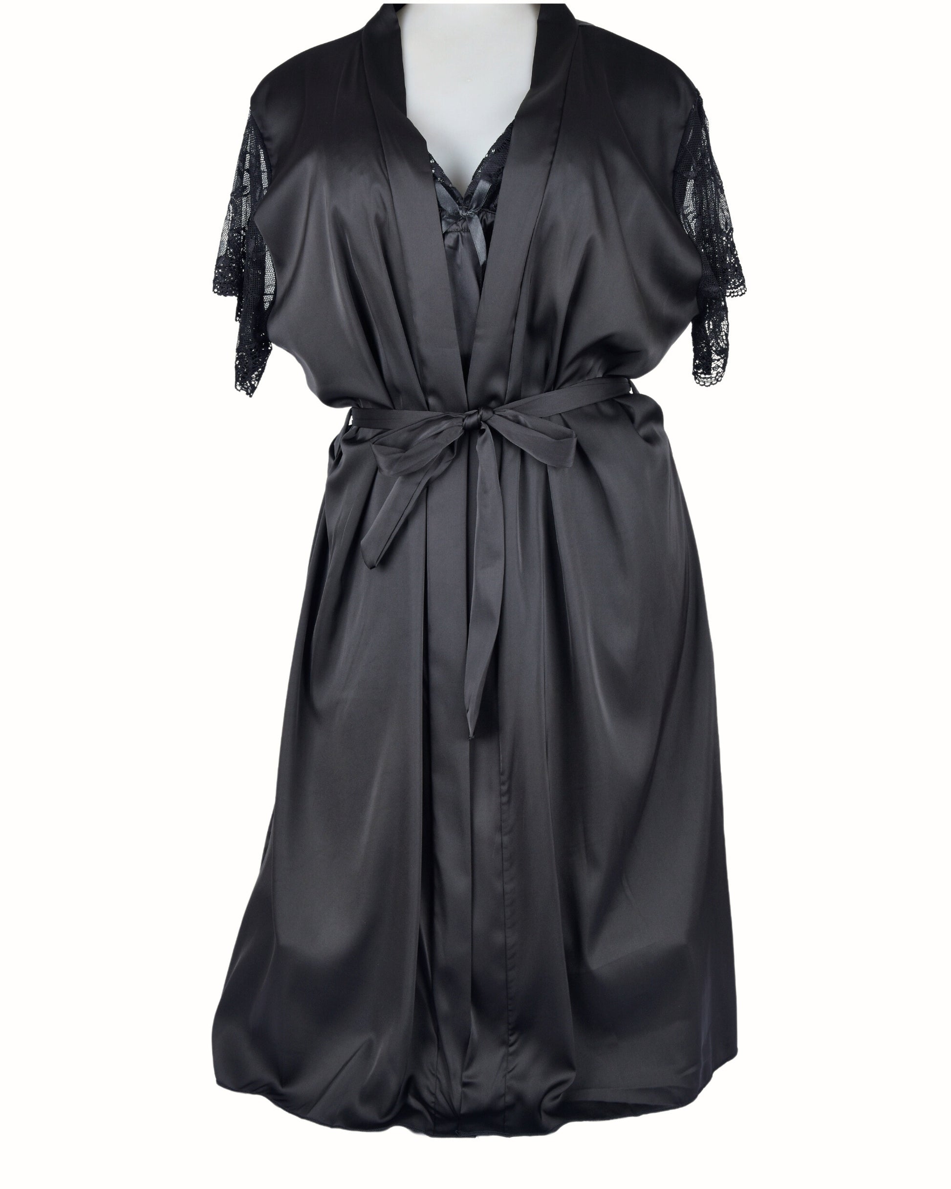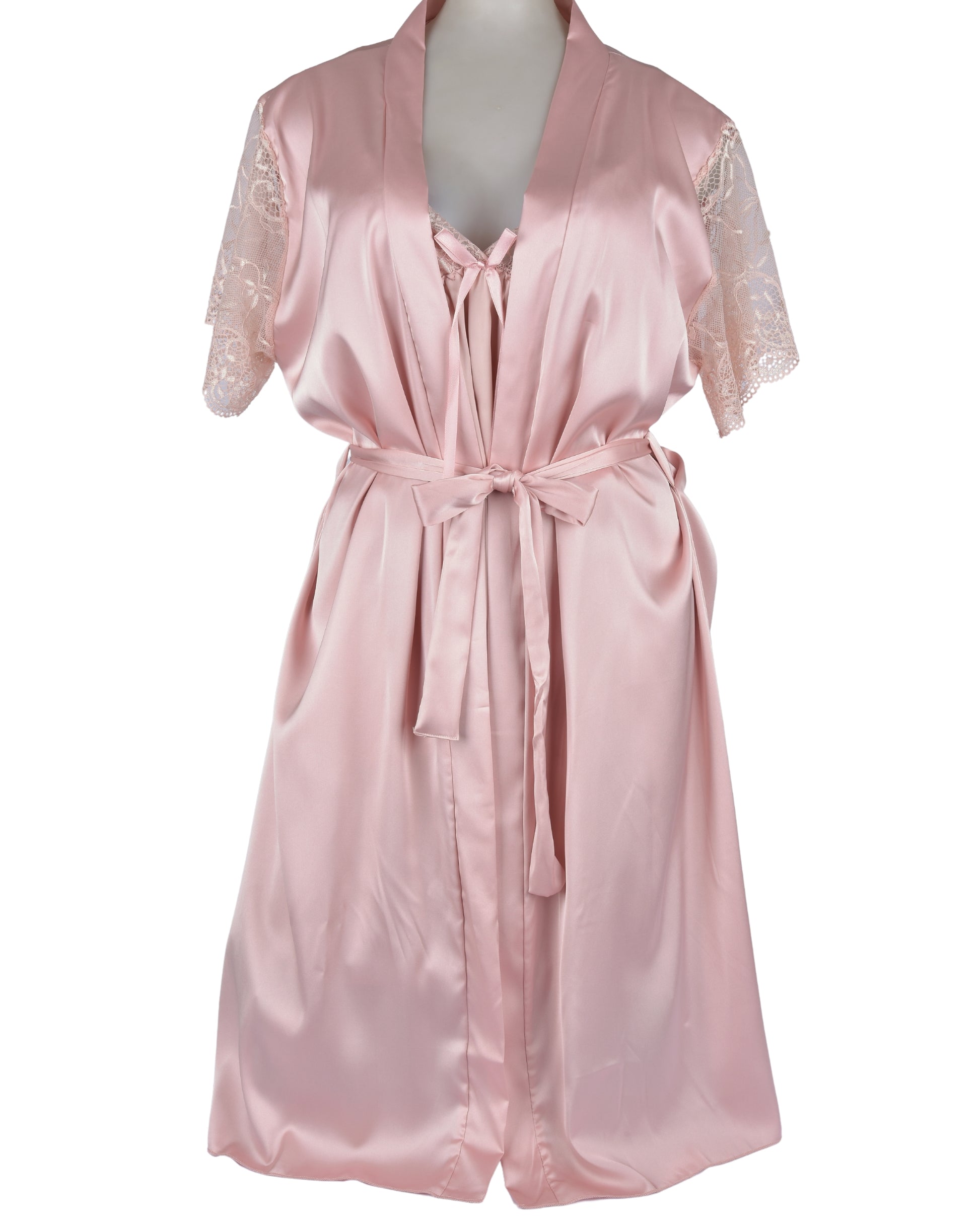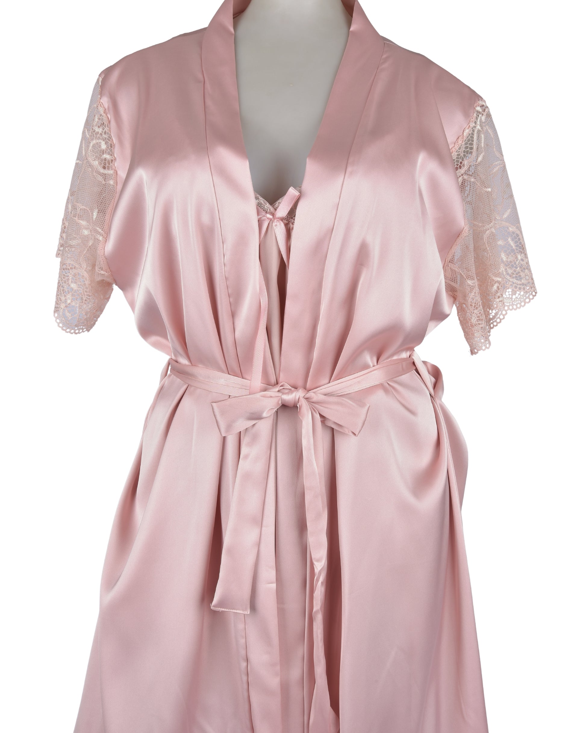This graceful short-sleeve nightdress features a silky satin body paired with delicate floral lace detailing at the sleeves, neckline, and hem. The flattering empire waistline is adorned with a charming satin bow, while the soft fabric glides gently over your skin, making it ideal for a restful night or relaxed lounging at home.