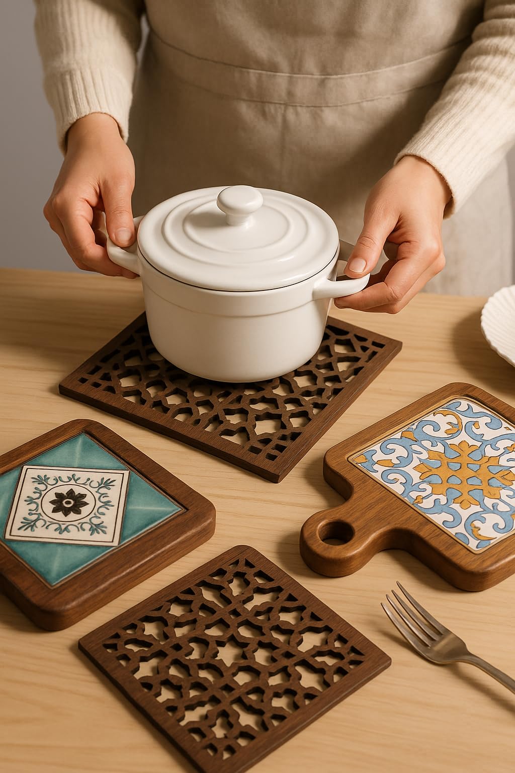 Premsons® Wooden Coasters & Trivet Pads offer durable, heat-resistant protection for your kitchen and dining surfaces. Crafted from eco-friendly bamboo, this set of 4 square trivets (20 x 20 cm) is perfect for holding hot pots, pans, and dishes in style.