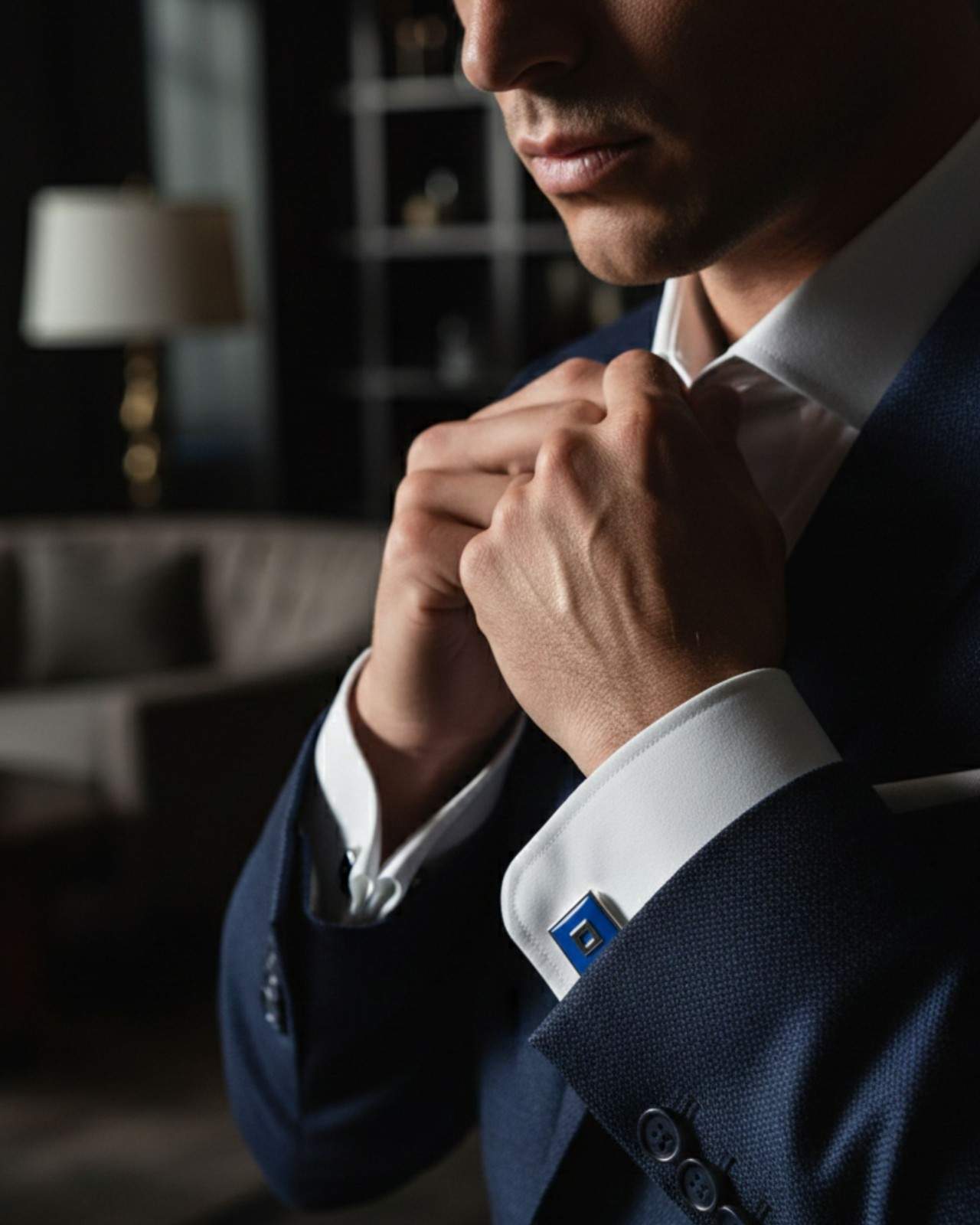 Premsons® Men’s Square Silver Cufflinks with Blue Enamel Centre, Minimalist Formal Shirt Accessories