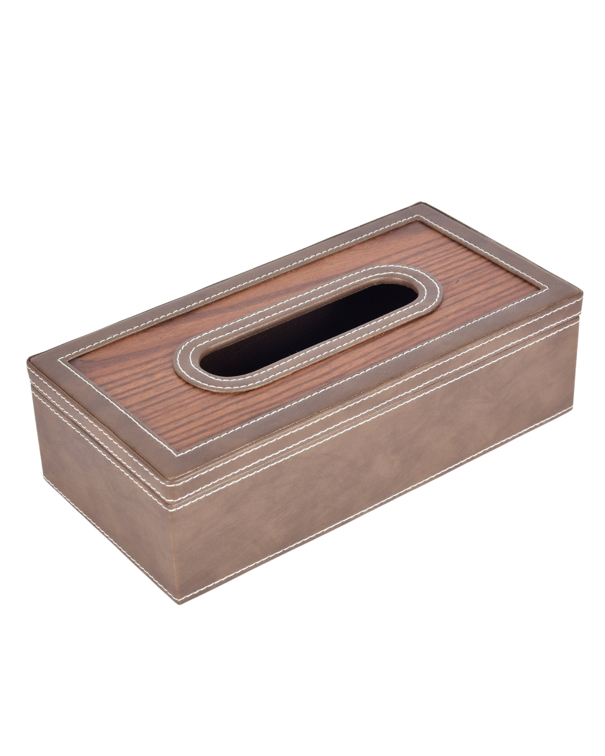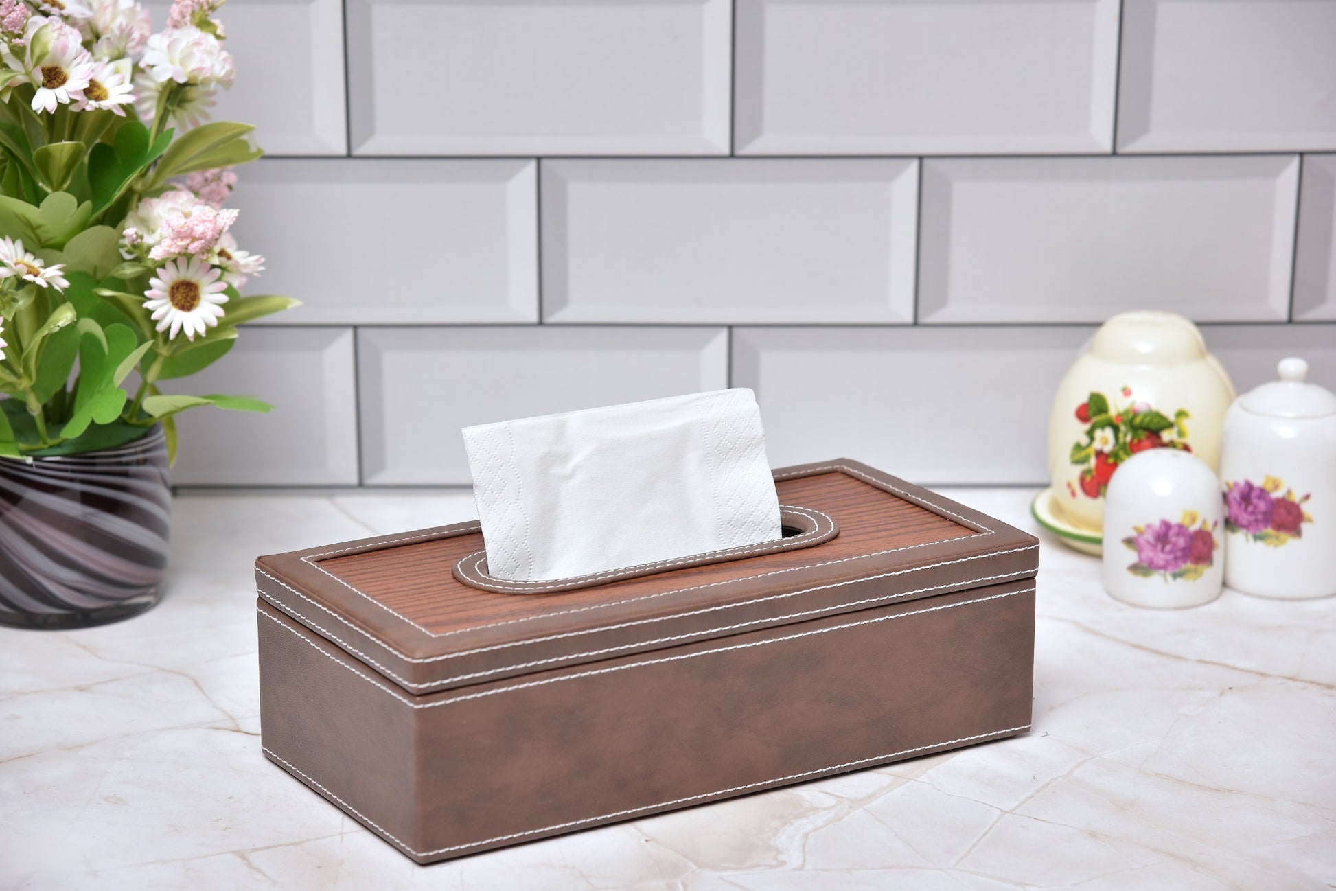 Premsons® Classic Rectangular Tissue Holder – Elegant Leatherette Tissue Box with Wooden Top Finish for Home, Office & Car – Stylish, Durable & Functional Tissue Dispenser for Everyday Use(Brown)
