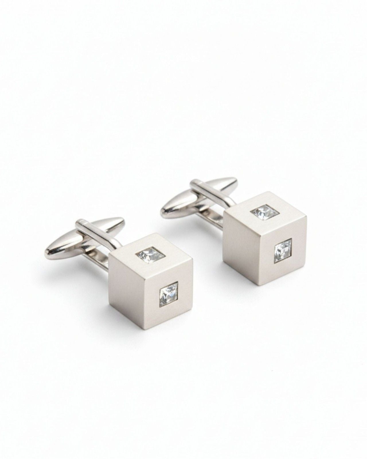 Premsons® Men’s Cube Silver Cufflinks with Clear Crystal Inlay, Minimalist Luxury Formal Accessories