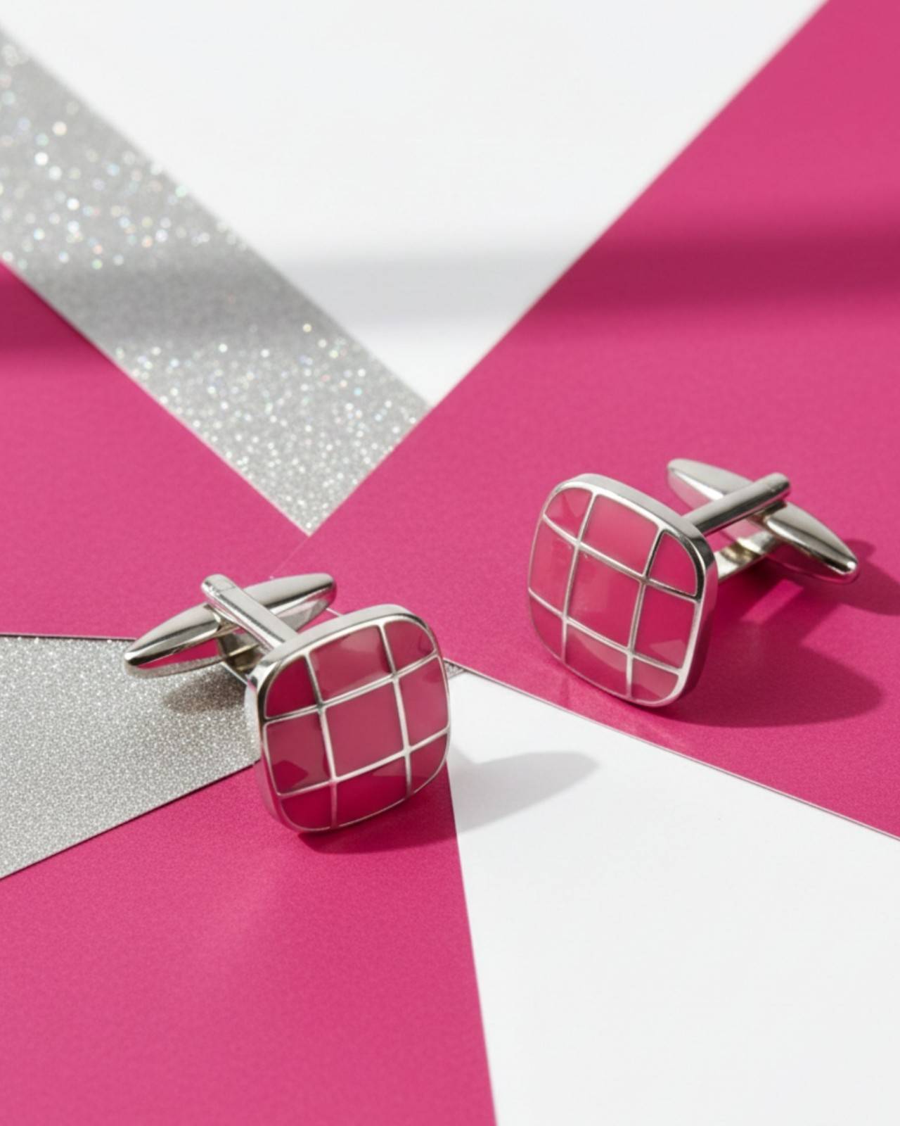 Premsons® Men’s Square Silver Cufflinks with Pink Grid Enamel Design, Classic Formal Shirt Accessories